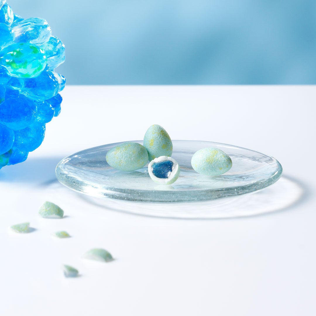 そんなシリーズの第3弾として発売した「空想果実 イトピスの実」は、深海で発見された空想上の果実で、爽やかな酸味と程よい甘みが特徴の味わいをしています。外側は深海での果皮の状態を再現したパリッと食感、内部は果肉そのものの柔らかい食感をイメージしました。グミ粒は涙のような「しずく型」で、鮮やかな青色が見た目にも美しい一粒になっています。