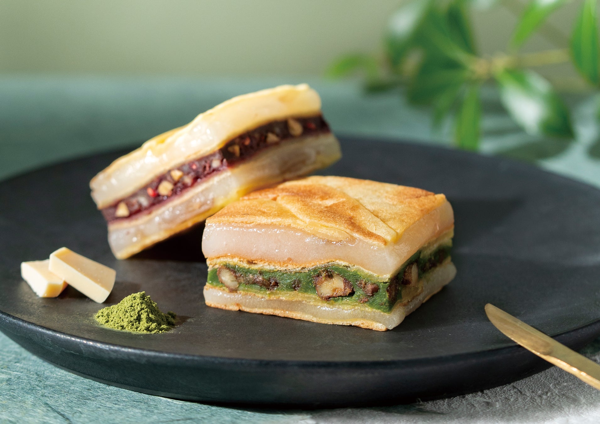 抹茶チョコレートガナッシュにチョコレートでコーティングしたくるみを合わせ、もっちり食感の羽二重餅で挟み、シュー生地でサンドしました。ホワイトチョコレートのまろやかでコクのある甘さが、抹茶の風味を引き立てます。