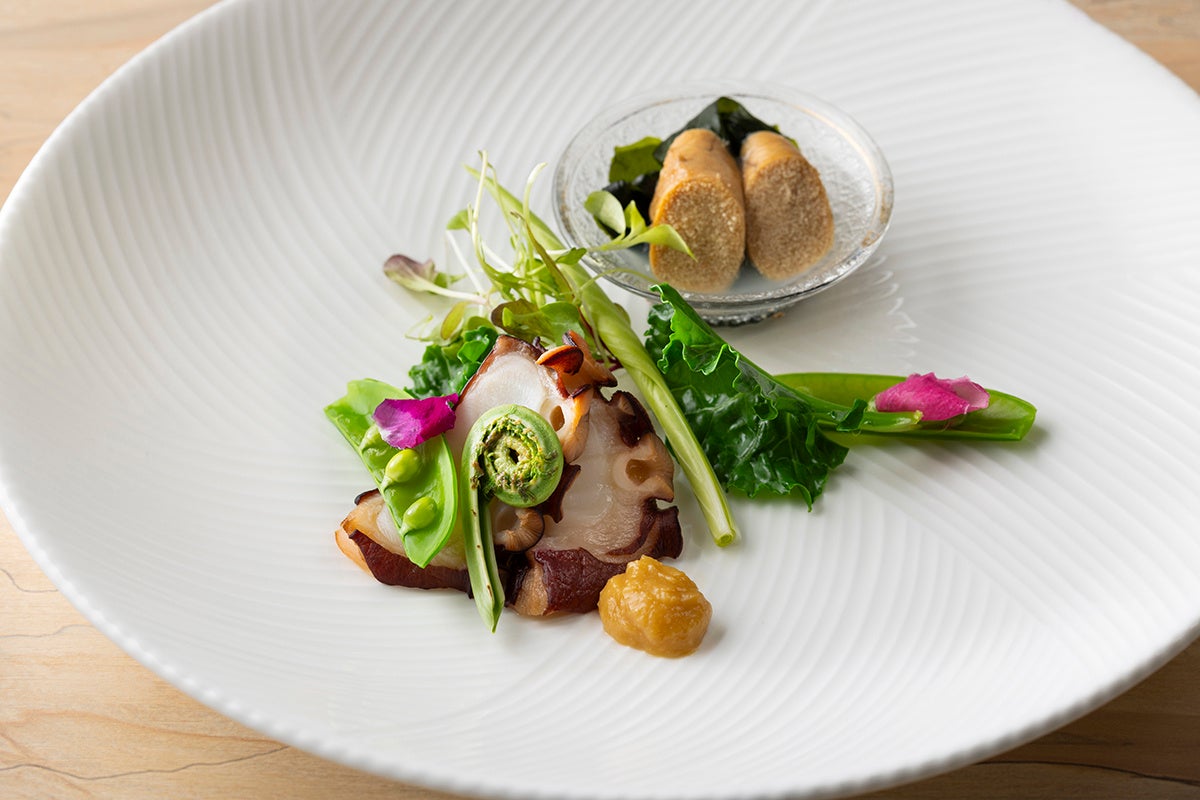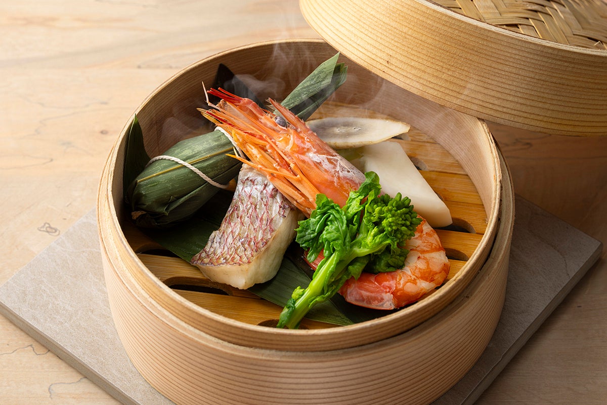 鯛と才巻海老のせいろ蒸し -ちまきとたけのこ、菜花添え-