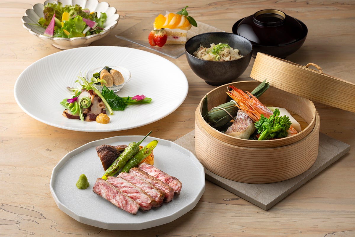 菖蒲コースには、鯛と才巻海老、ちまきなどをせいろ蒸しにした節句の風情を感じる魚料理をはじめ、メインには近江牛をご提供。ミニ菖蒲コースでは近江牛や鉄板で作るオムライスを、キッズコースでは鶏肉のからあげや鉄板で作るオムライスをお楽しみいただけます。早期予約特典として、大人2名様以上で4月28日(火)までに菖蒲コースをご予約の場合、キッズコース1名様分を無料といたします。