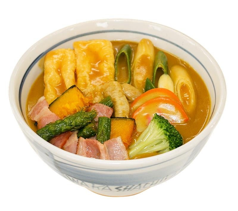 素揚げしたかぼちゃ・アスパラ、ベーコン、ブロッコリーをトッピング。味・彩り・食べ応えすべて満点のコラボカレーうどん。