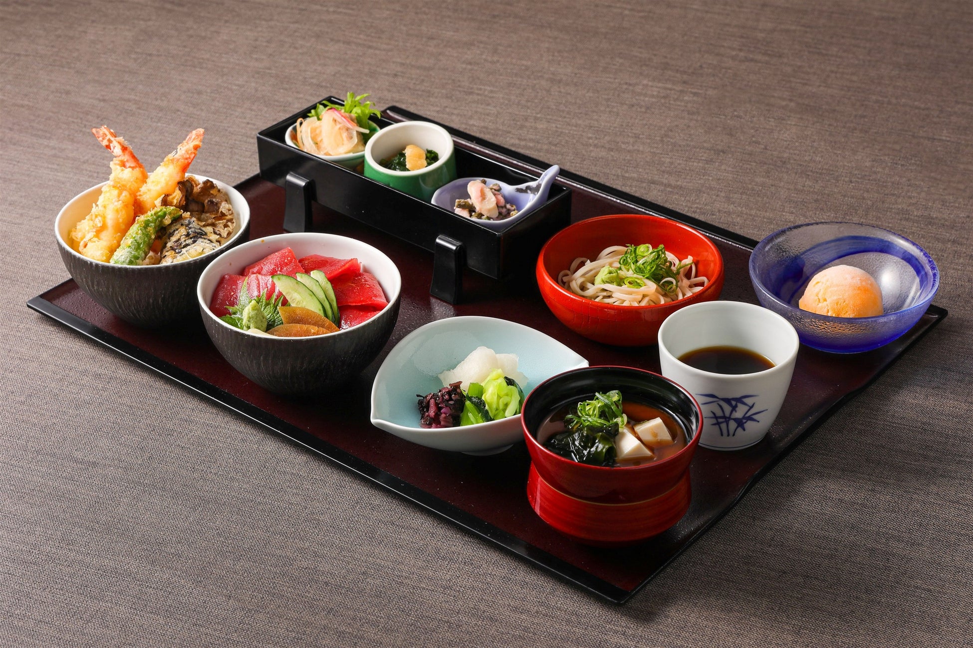 素材本来の味わいを、よりカジュアルにお愉しみいただけるよう、選べる2種の丼ぶりに、ミニ蕎麦、小鉢、香の物、赤出汁に、シャーベットが付いた軽やかなセットも。