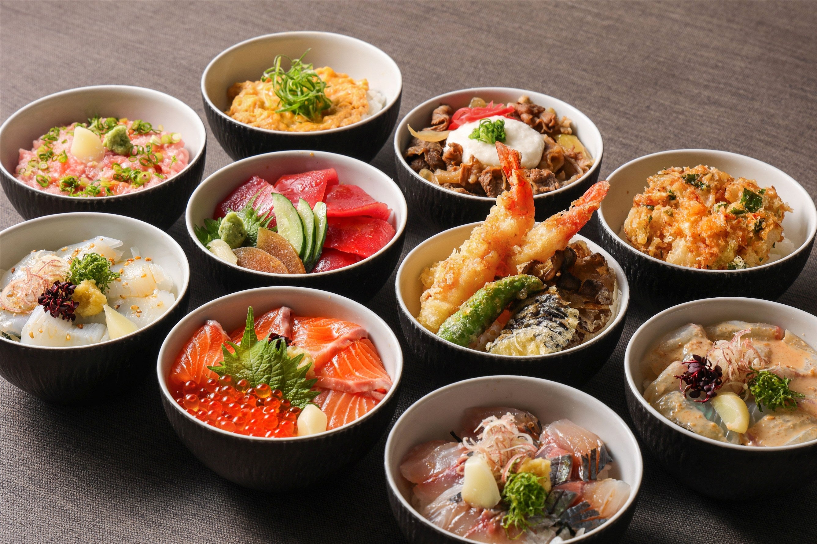 特製醤油だれにじっくりと漬け込み、赤身の旨味を最大限に引き出した王道の「鮪漬丼」や、脂ののったとろけるサーモンと、ぷちぷちと弾けるいくらが魅力の「サーモンいくら丼」、新鮮な真鯛の引き締まった身と淡白な旨味に、風味豊かな濃厚胡麻ダレがとろりと絡む「真鯛胡麻ダレ丼」をはじめ、初夏を感じる「桜海老のかき揚げ丼」や「鯵丼」、お肉派に嬉しい「牛とろろ丼」など、海の幸・山の幸をふんだんに使用した全10種類のミニ丼をご用意しました。
