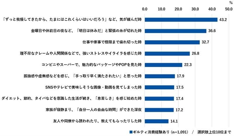 1位は「ずっと我慢してきたから、たまにはいいだろうと気が緩んだ時(43.2%)」、次いで「金曜日や休前日の夜など、明日は休みだと緊張の糸が切れた時(36.6%)」、「極限まで疲れ切った時(32.7%)」と続きました。日々の節約やタイパ重視の生活による“我慢の限界”が引き金となっているようです。【図表7】