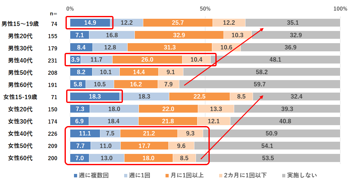 性年代別に見てみると、若い世代ほど頻度が高い傾向にあり、10代では「週に複数回」という高頻度層が男女ともに約15~18%いました。また、若い世代だけでなく、“健康が気になるお年頃”の40~60代も約30~40%の人が「月に1回以上」、特に女性の方が高い頻度で意識的にギルティ消費を行っていることがわかりました。【図表2】