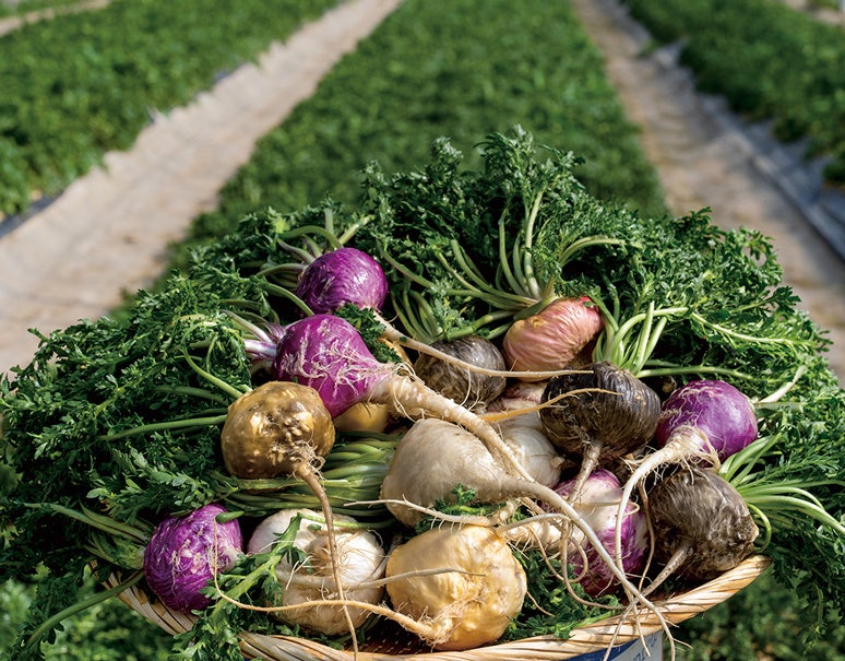 葉はすぐに変色してしまいますが、よく洗浄してから一緒にお届けする鮮度保持袋に入れて冷蔵保存すれば5〜7日ほど日持ちします。葉を切り落としたカブのような球の部分だけであれば、3ヵ月ほど保存できます。