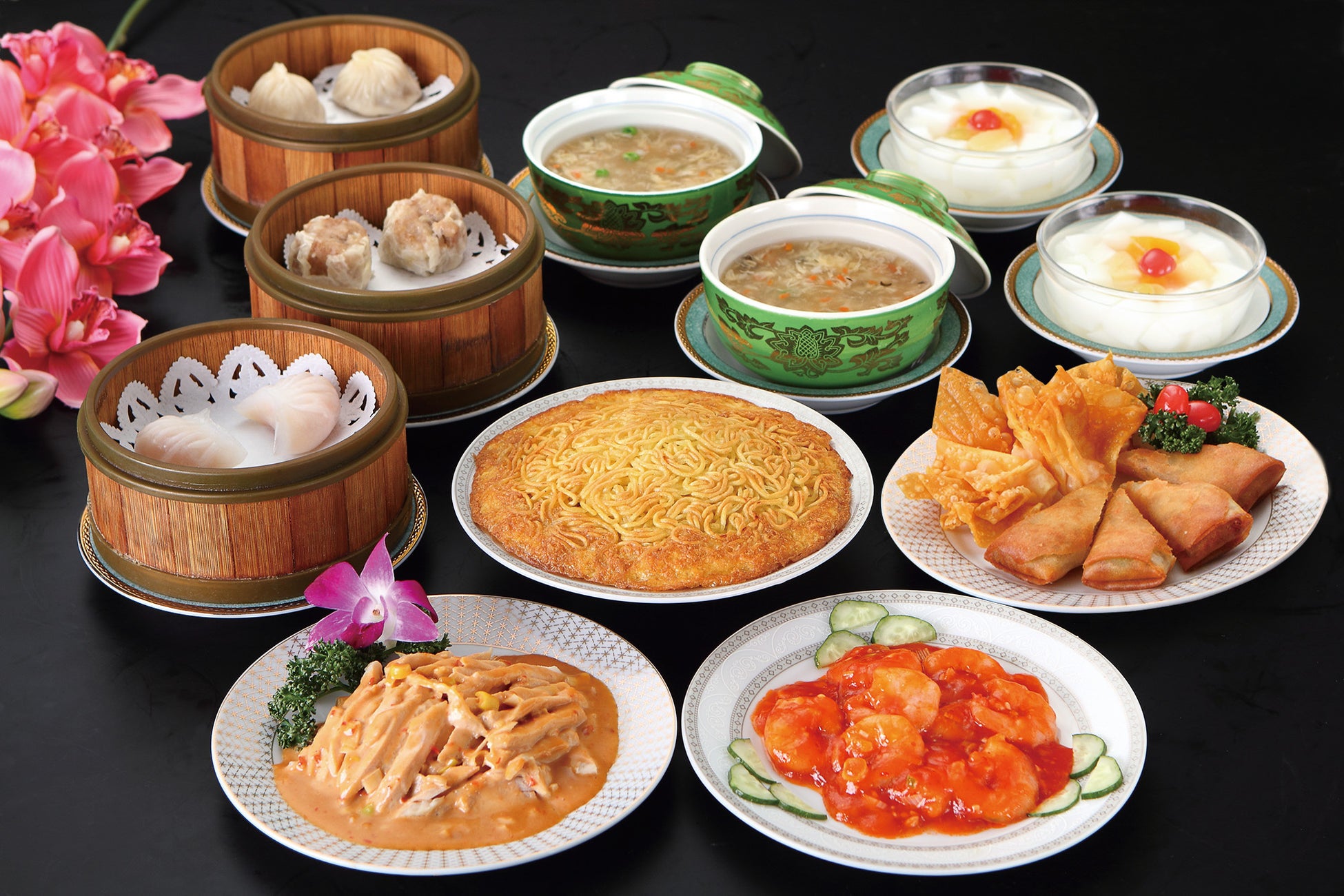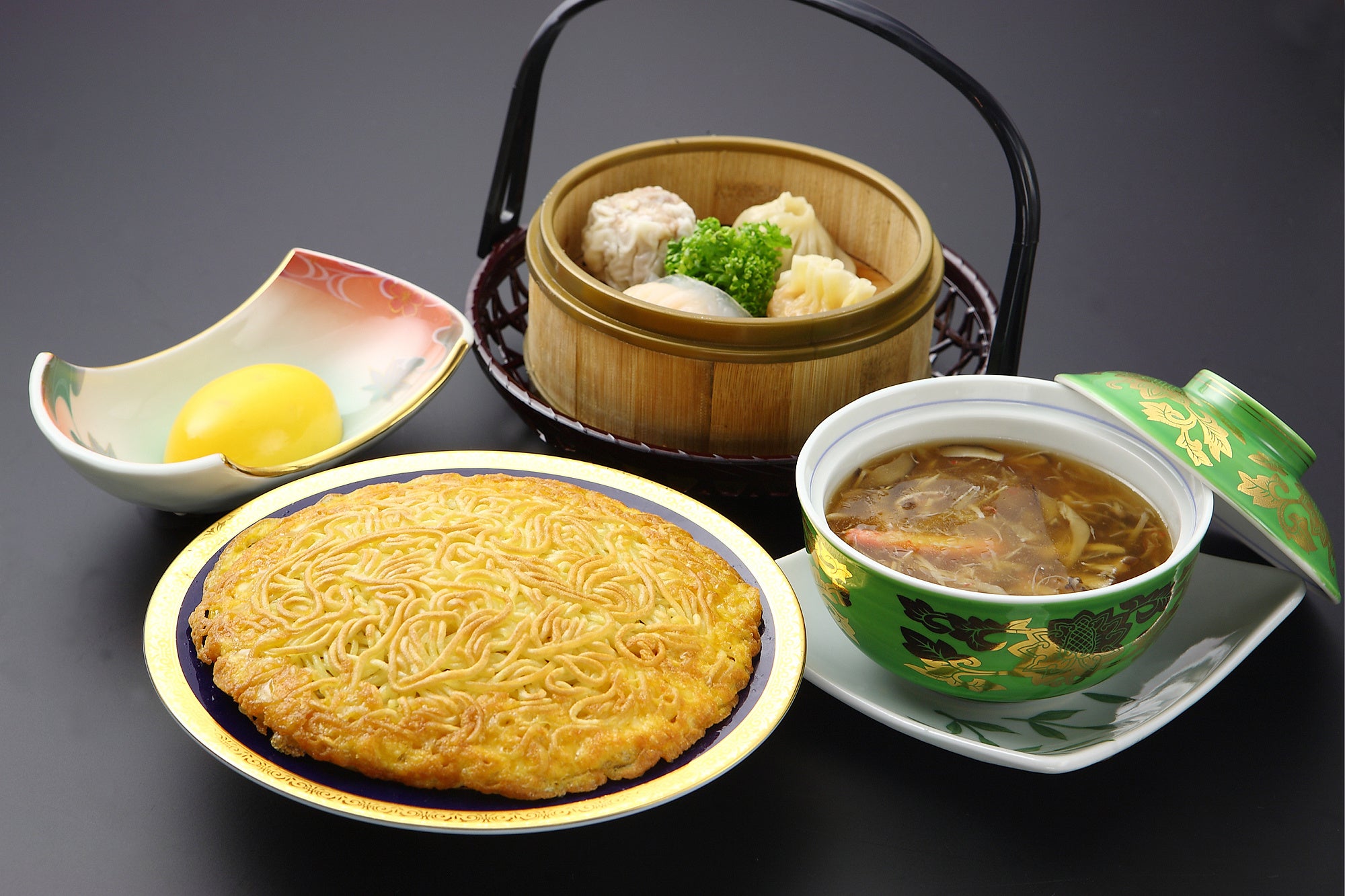 梅蘭焼きそば(小)・蒸し点心盛り合わせ・ふかひれスープ・マンゴープリンの全4品が食べられるお得なセット。