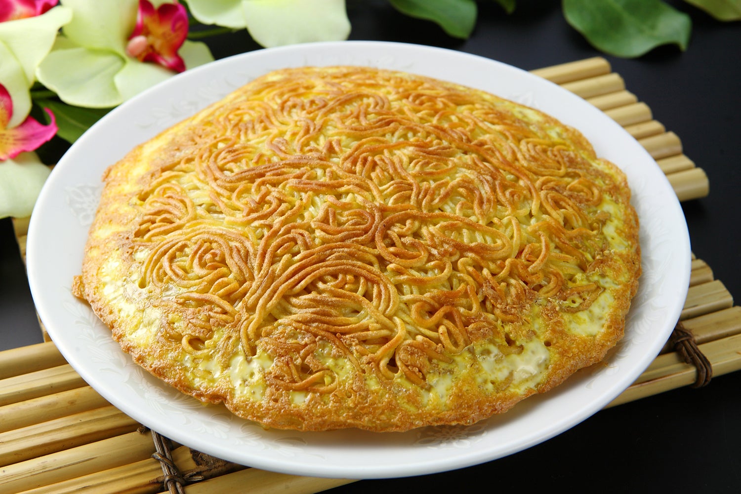 カリッと香ばしく焼き上げた中華麺の中に、とろりとした醤油味の餡を閉じ込めたオリジナル焼きそば。炒めた豚肉、にら、もやし、玉葱などさまざまな具材が包まれている、梅蘭の看板メニューです。