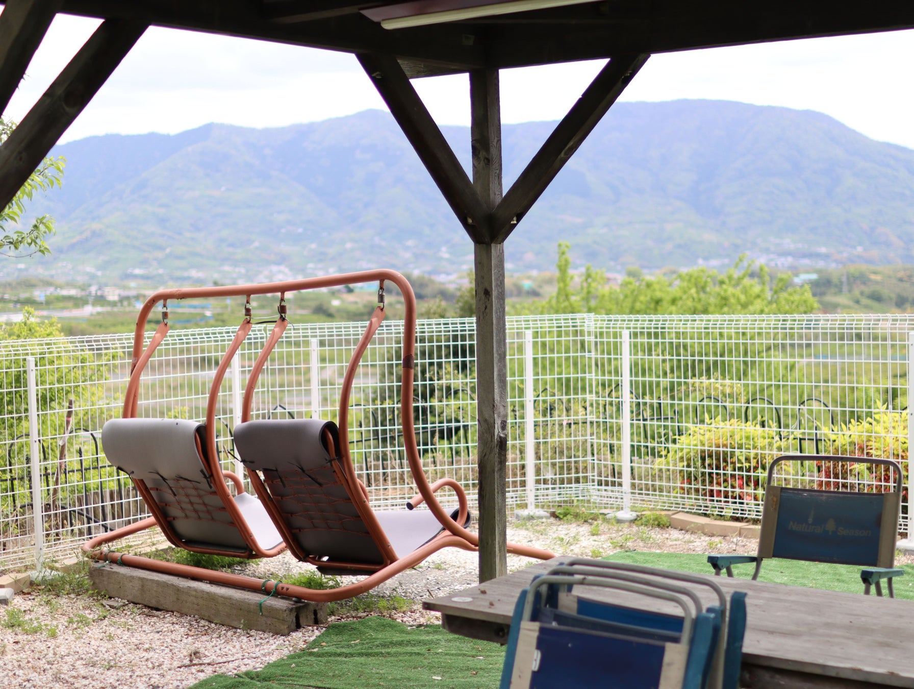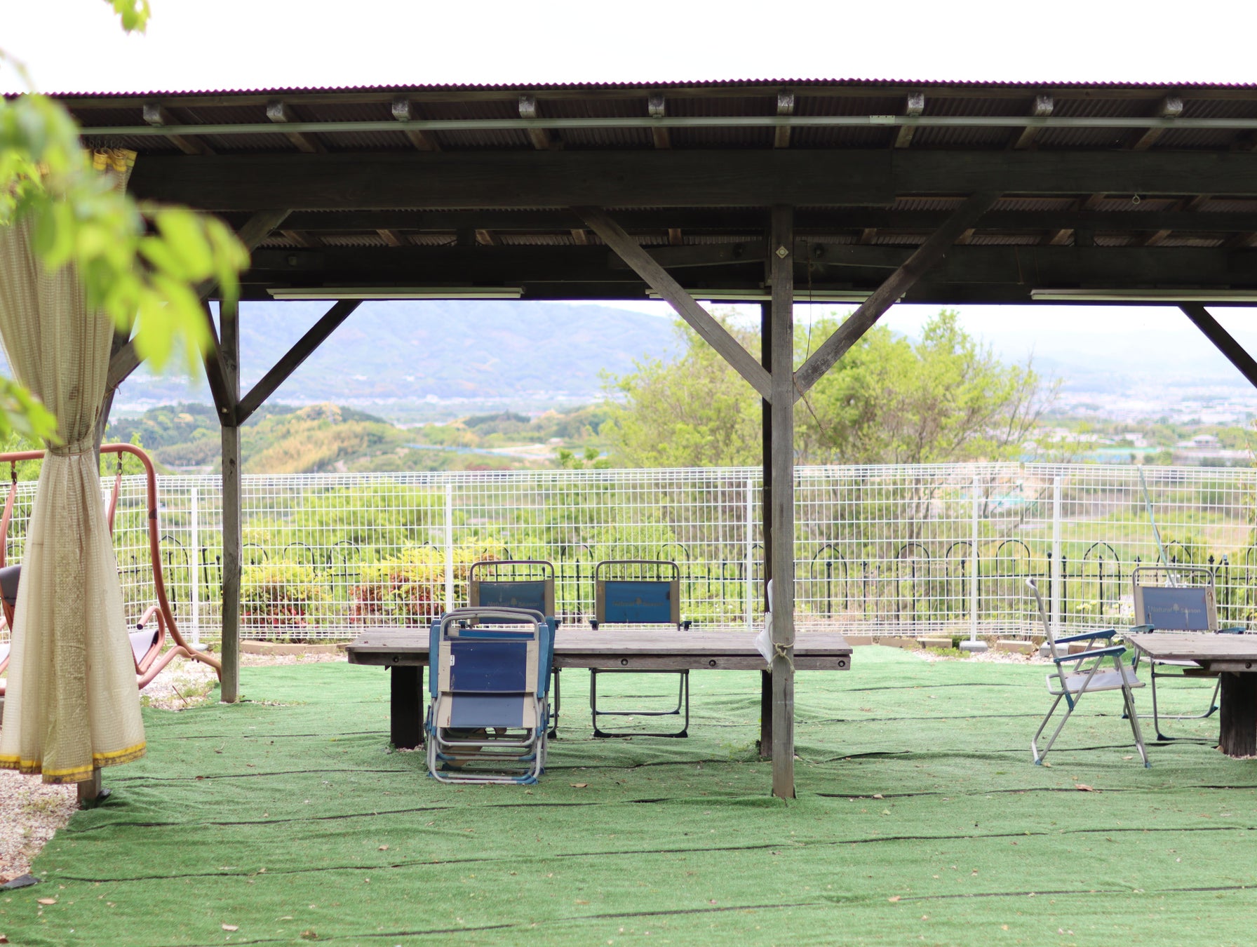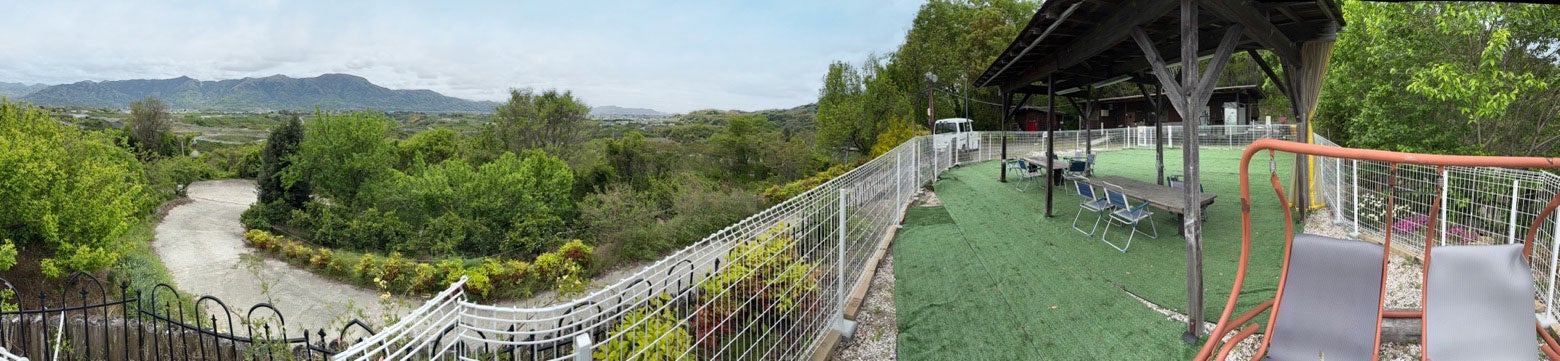 観音山フルーツガーデンから徒歩約5分、丘の上に位置する専用エリアです。山々と紀の川を一望できるロケーションで、ブランコ席やテント下の休憩スペースも完備。飼い主さまものんびりとくつろげます。