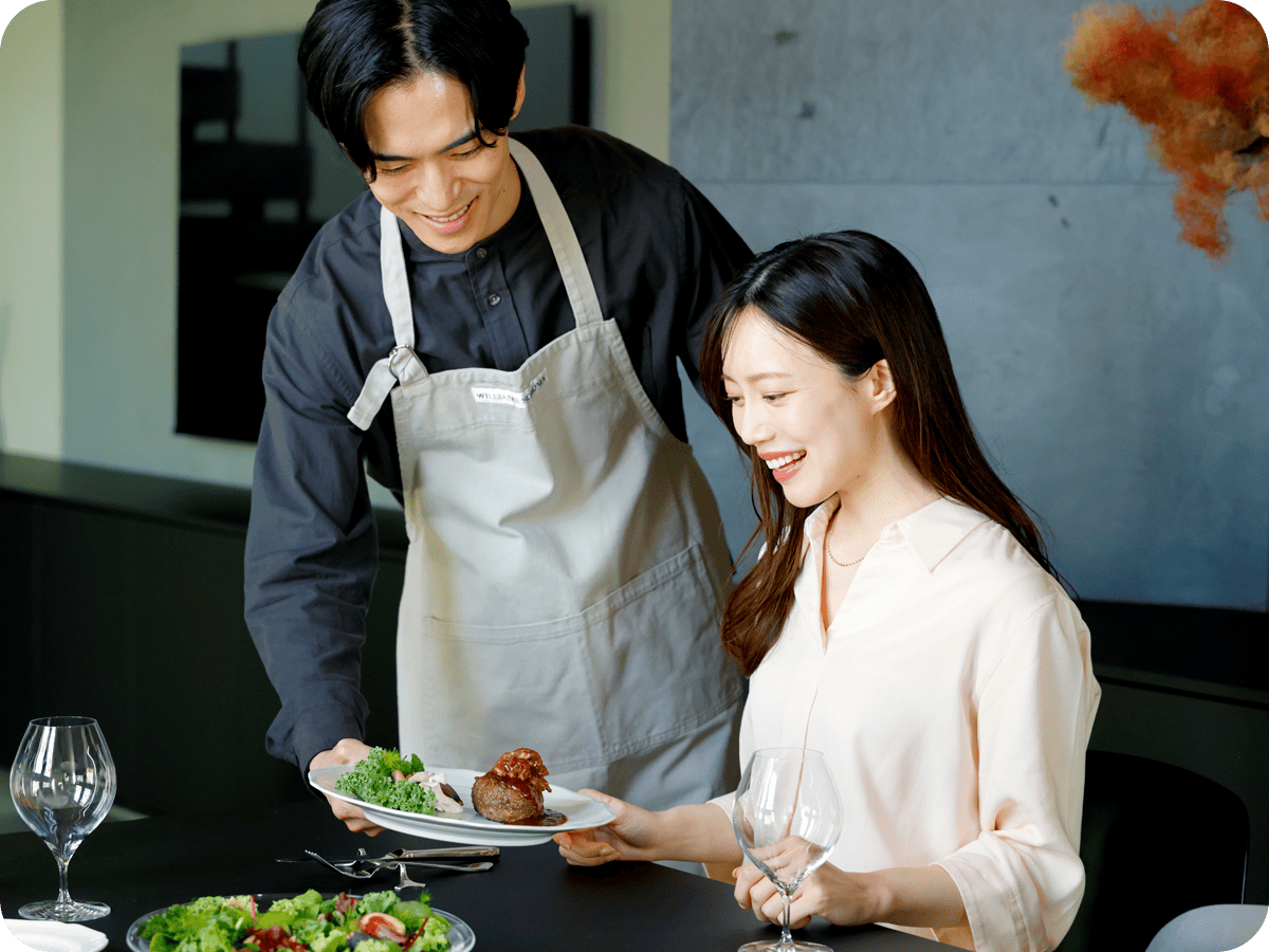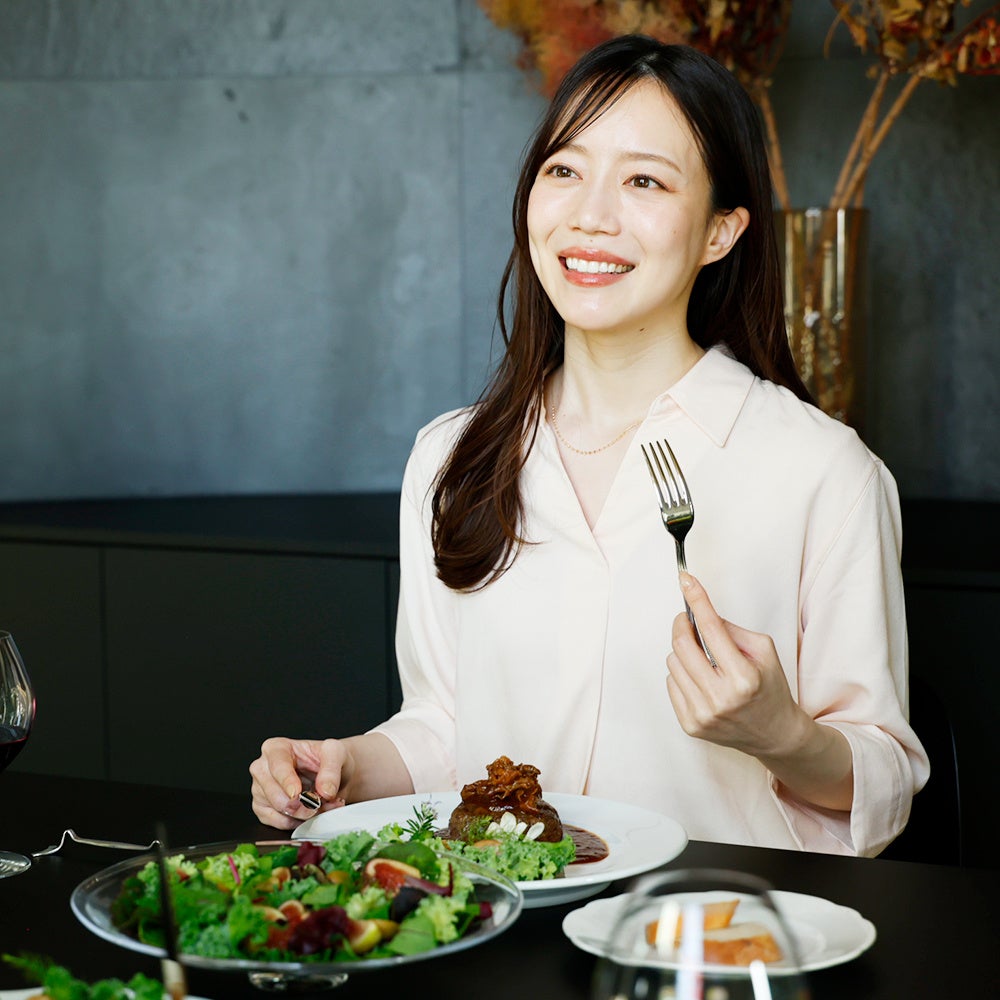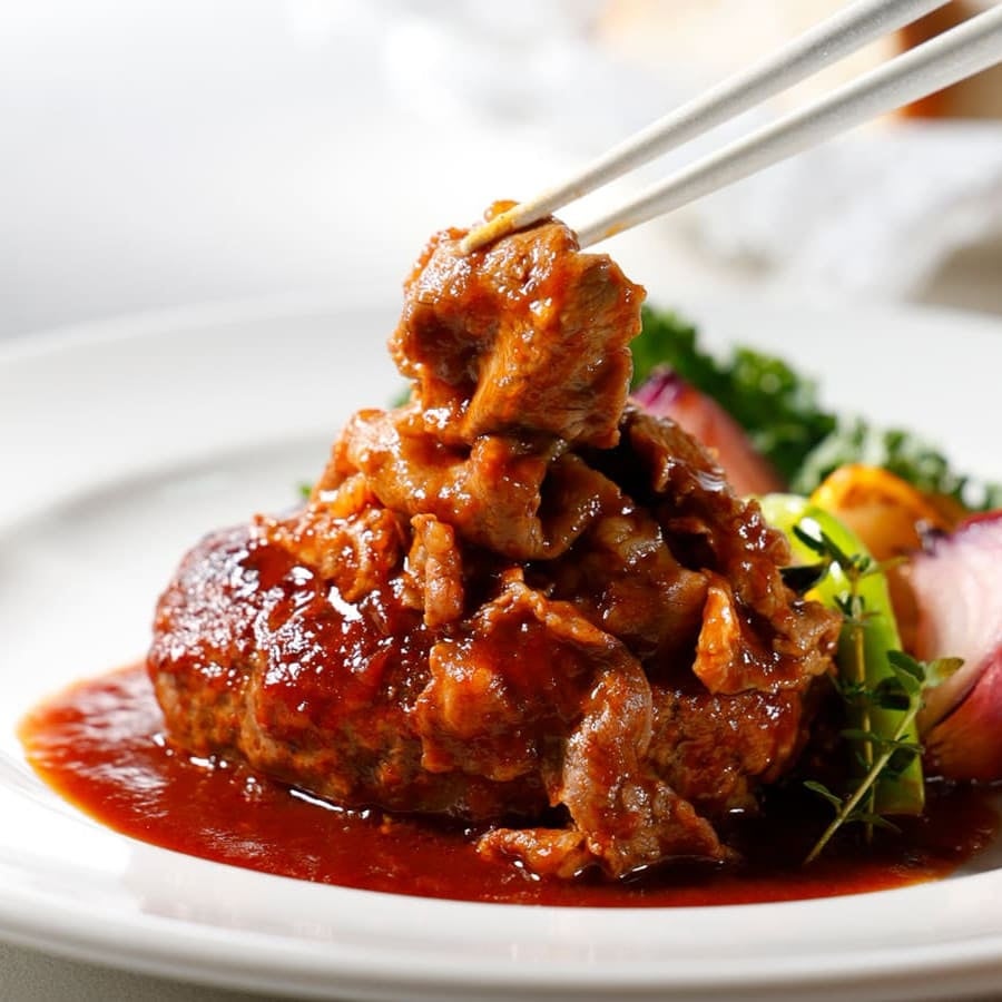 旨味あふれる近江牛100%のハンバーグに近江牛スライスを贅沢に重ね、芳醇デミグラスで仕立てた一皿。