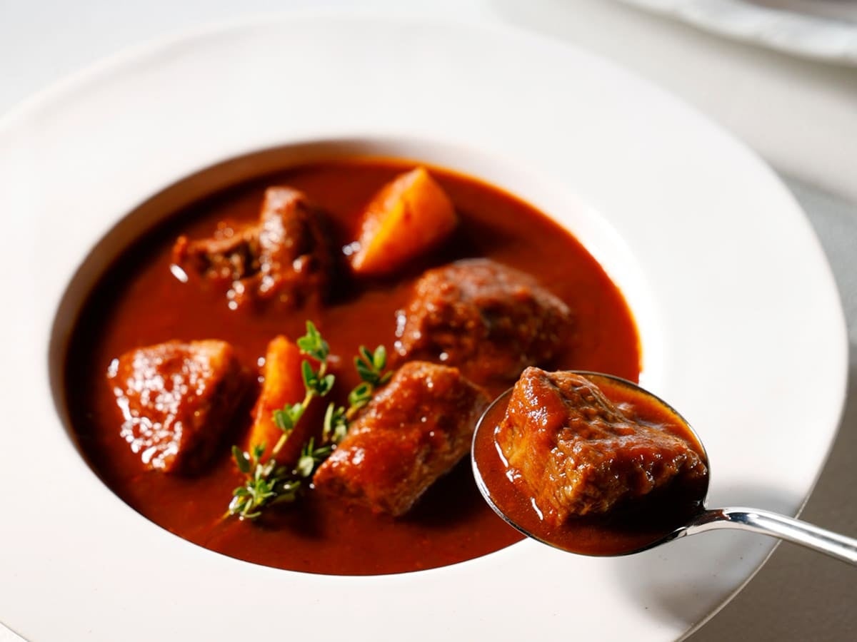 ごろっと大きめにカットした柔らかな近江牛を贅沢に使用。96時間、自家製デミグラスで丁寧に煮込み、旨みを閉じ込めた濃厚でコク深い一皿。