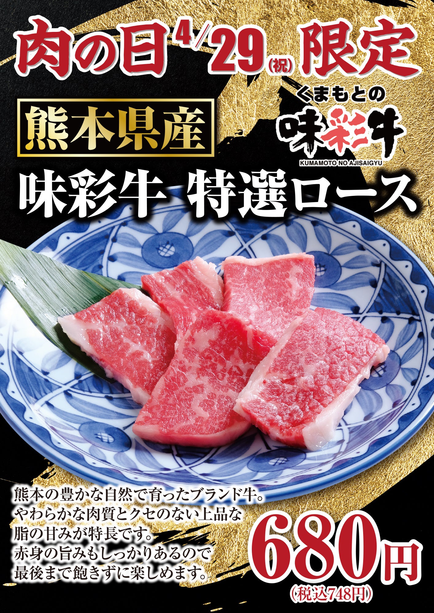 株式会社あみやき亭(本社:愛知県春日井市)は、2026年4月29日(祝)の“肉の日”限定で、熊本県産ブランド牛「味彩牛(あじさいぎゅう)」を使用した**「特選ロース」**を特別価格にて販売いたします。