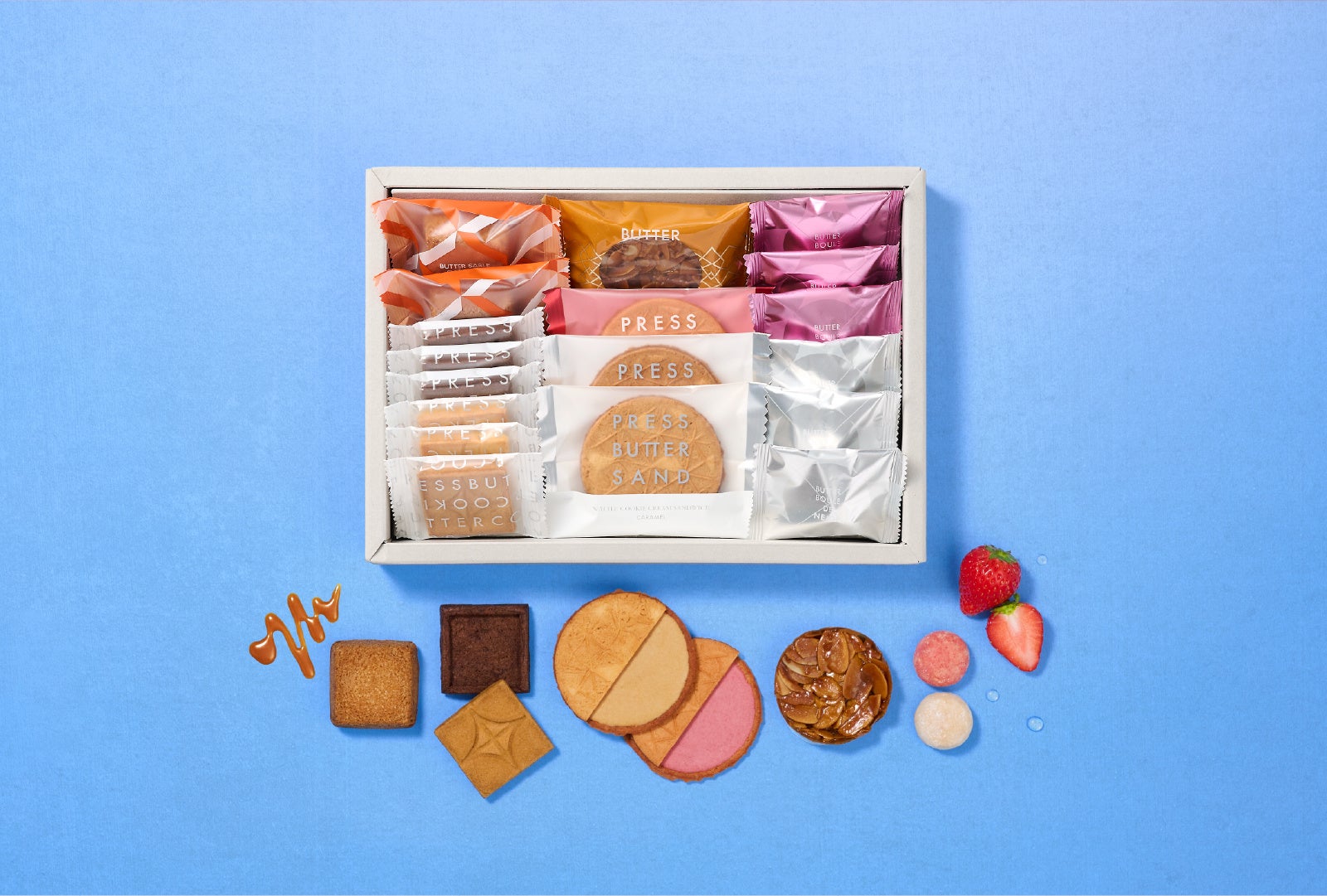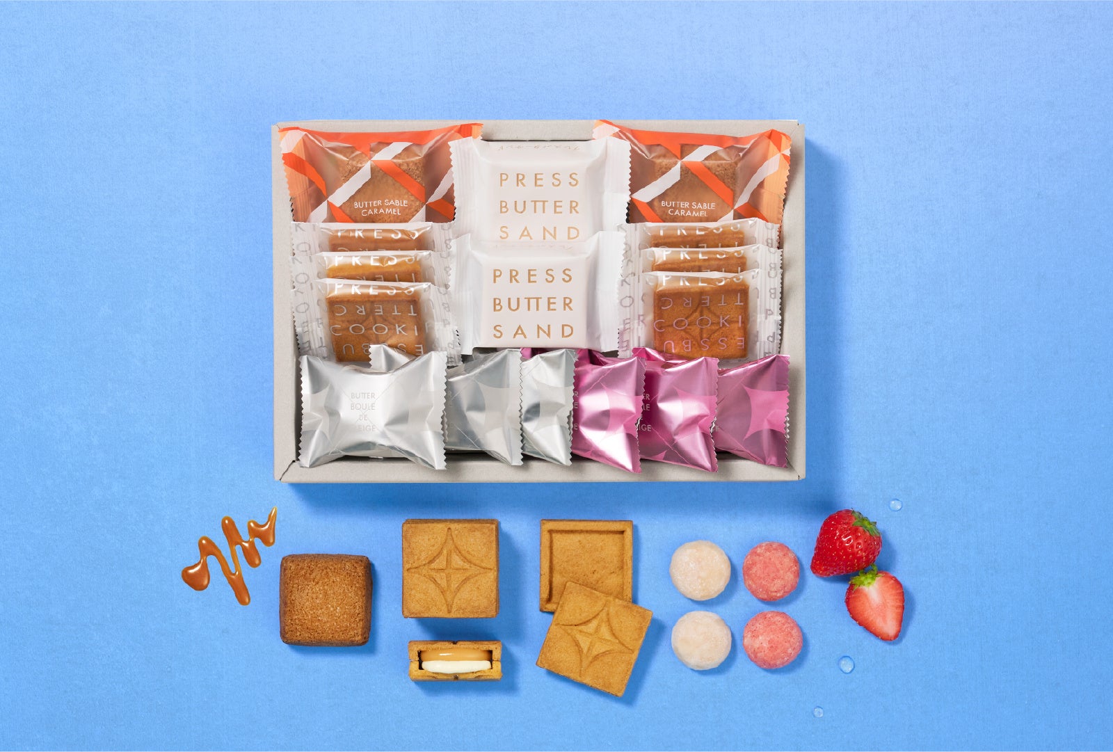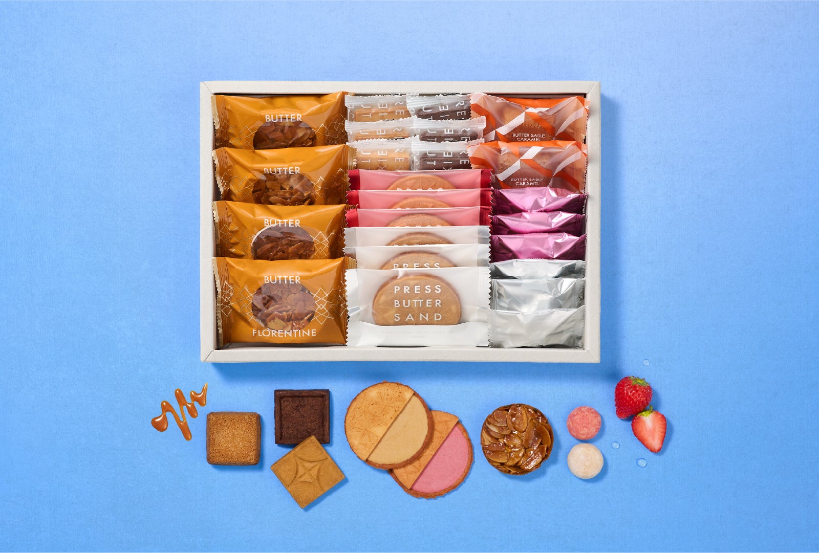 ・内容 :プレスバタークッキー ×3個、プレスバタークッキー〈チョコレート〉 ×3個、バターサブレ〈キャラメル〉 ×2個、バターフロランタン ×4個、ワッフルクッキーサンド〈キャラメル〉 ×3個、ワッフルクッキーサンド〈苺〉 ×3個、ブールドネージュ ×3個、ブールドネージュ〈苺〉 ×3個