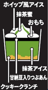 香りと旨みが際立つ「nana’s green tea オリジナルブレンド 抹茶」に北海道産生クリームを合わせた上質な味わいの抹茶アイスをベースに、すっきりとした甘さのつぶあんや抹茶蜜、おもち、クッキークランチなど6種類の素材を重ねています。食べ進めるごとに変化する多彩な食感と、抹茶の深いコクが織りなす重層的な味わいをお楽しみください。