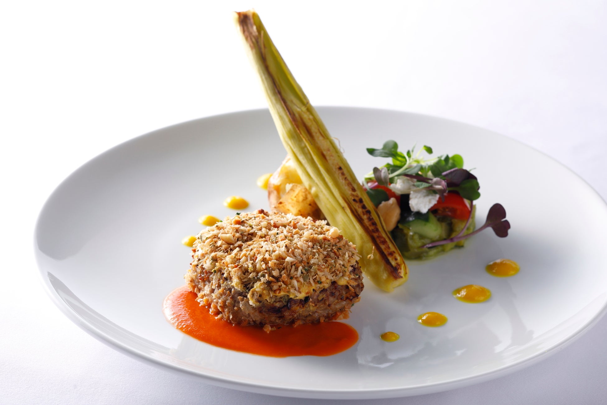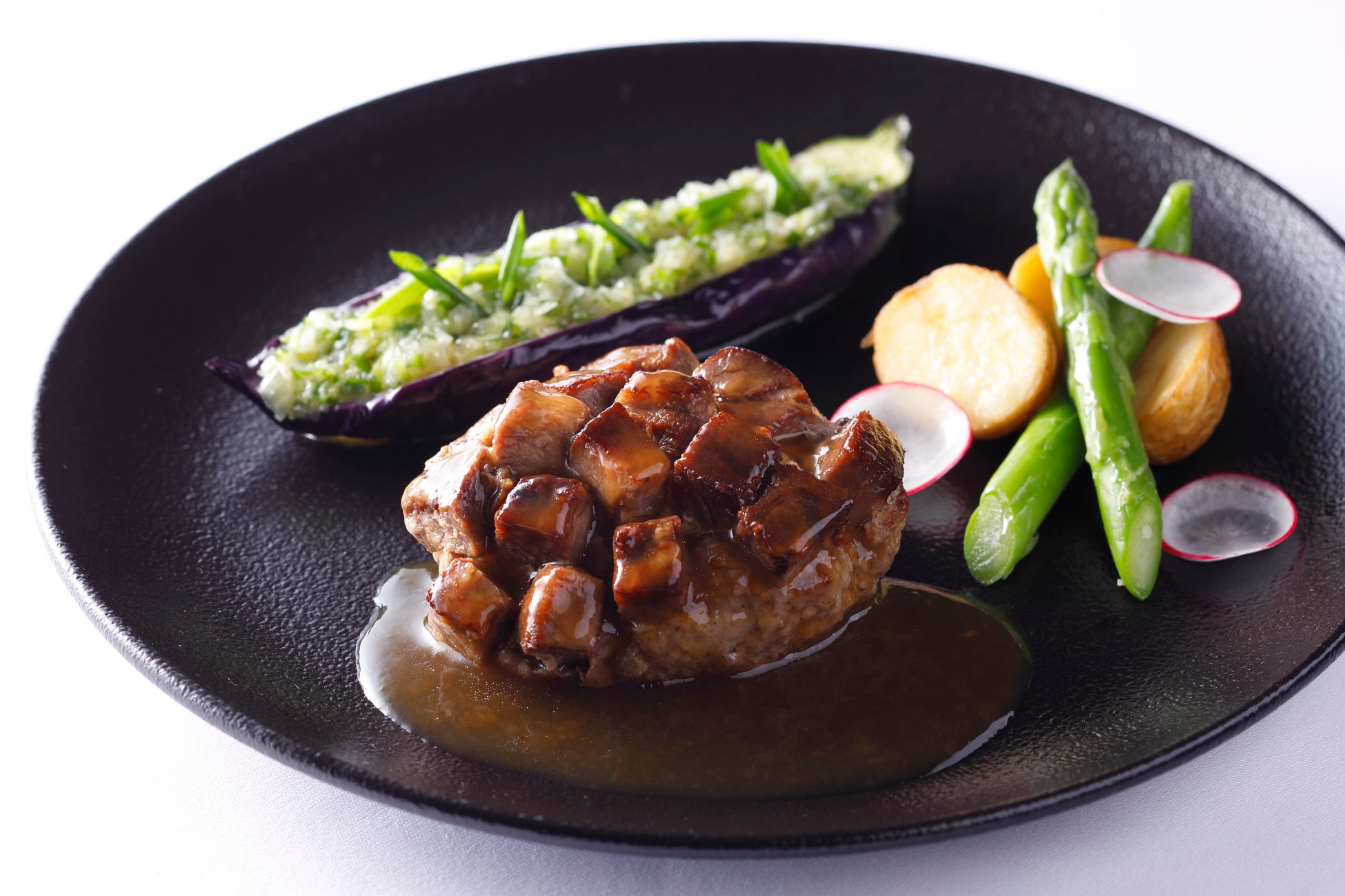 ハーブとアーモンドを合わせた香ばしいパン粉をハンバーグステーキの上にあしらい、上品な香りを添えました。オレガノとレモンで爽やかに仕上げた夏野菜と、ほどよい酸味が心地よいトマトソースとともにお楽しみください。