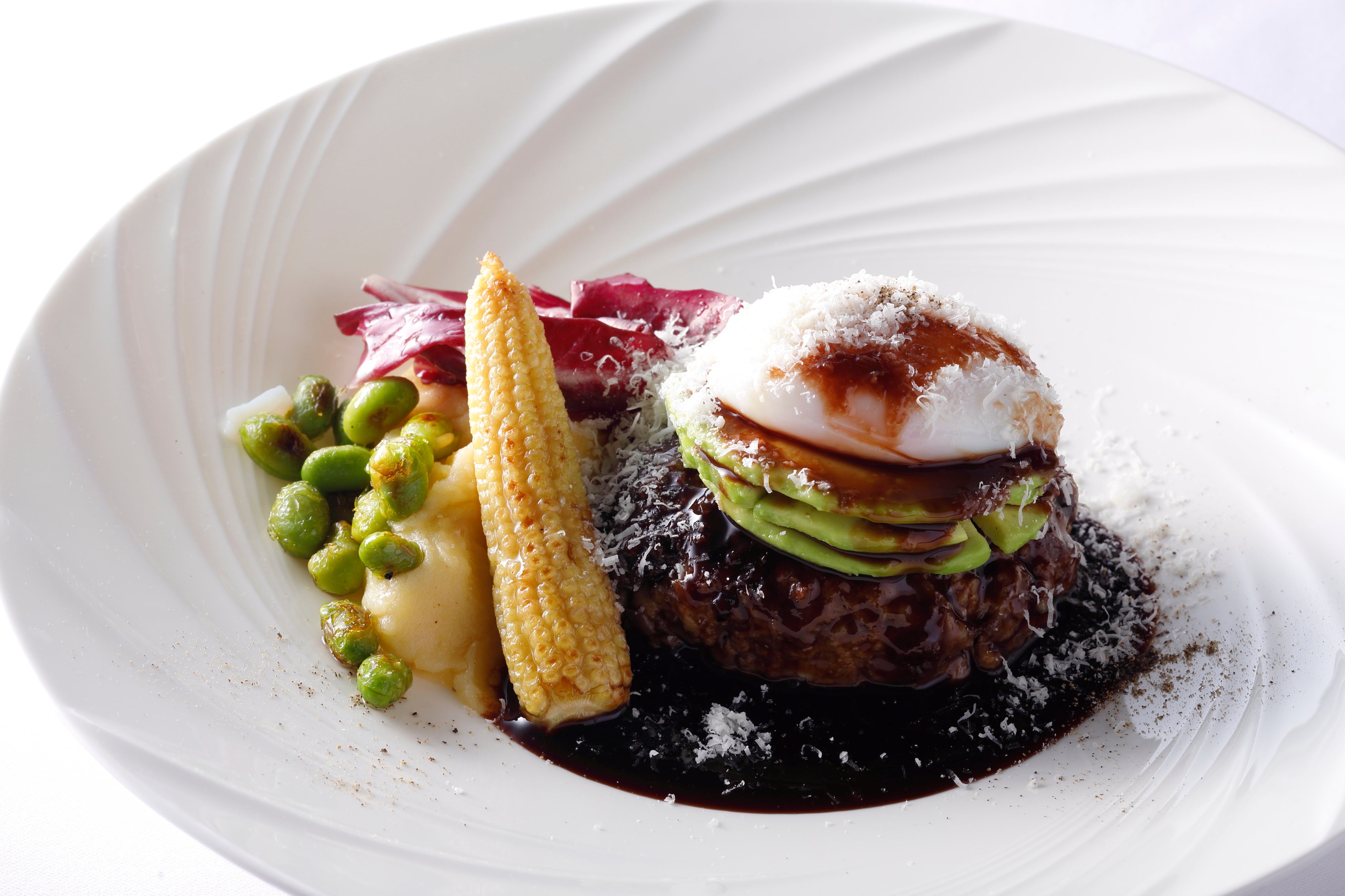 「飛騨牛」100%のハンバーグステーキとアボカド、ペコリーノチーズを合わせました。赤ワインソースとともにお召し上がりください。