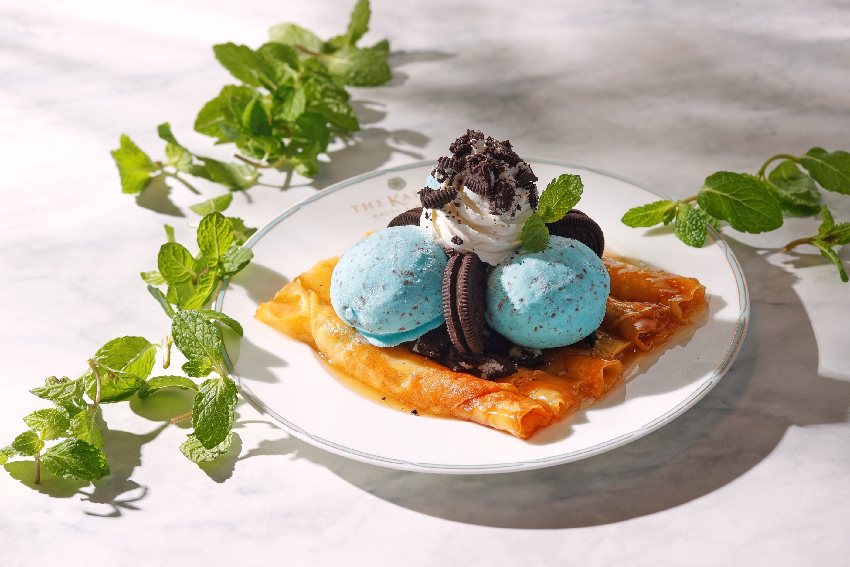 今回ご用意するのは、そんなクラシックな味わいに、爽快感を重ねた一皿です。クラッシュしたココアクッキーのザクザクした食感、チョコミントアイスの清涼感、軽やかなホイップクリーム。それぞれの要素が重なり合うことで、ひと口ごとに表情を変える味わいをお楽しみいただけます。一見すると意外性のある組み合わせながら、メープルバターのコクとミントの清涼感は、互いを引き立て合う関係です。濃密な甘さに、すっと抜けるような爽やかさが重なることで、最後のひと口まで軽やかに楽しめる仕上がりとなりました。チョコミントは、その個性的な風味から、長く愛され続ける一方で、明確な“好み”を持つフレーバーでもあります。本メニューでは、その魅力を最大限に引き出しながら、上質なデザートとして再構築。定番とは異なる切り口で、シンパンケーキの新たな可能性をお届けいたします。