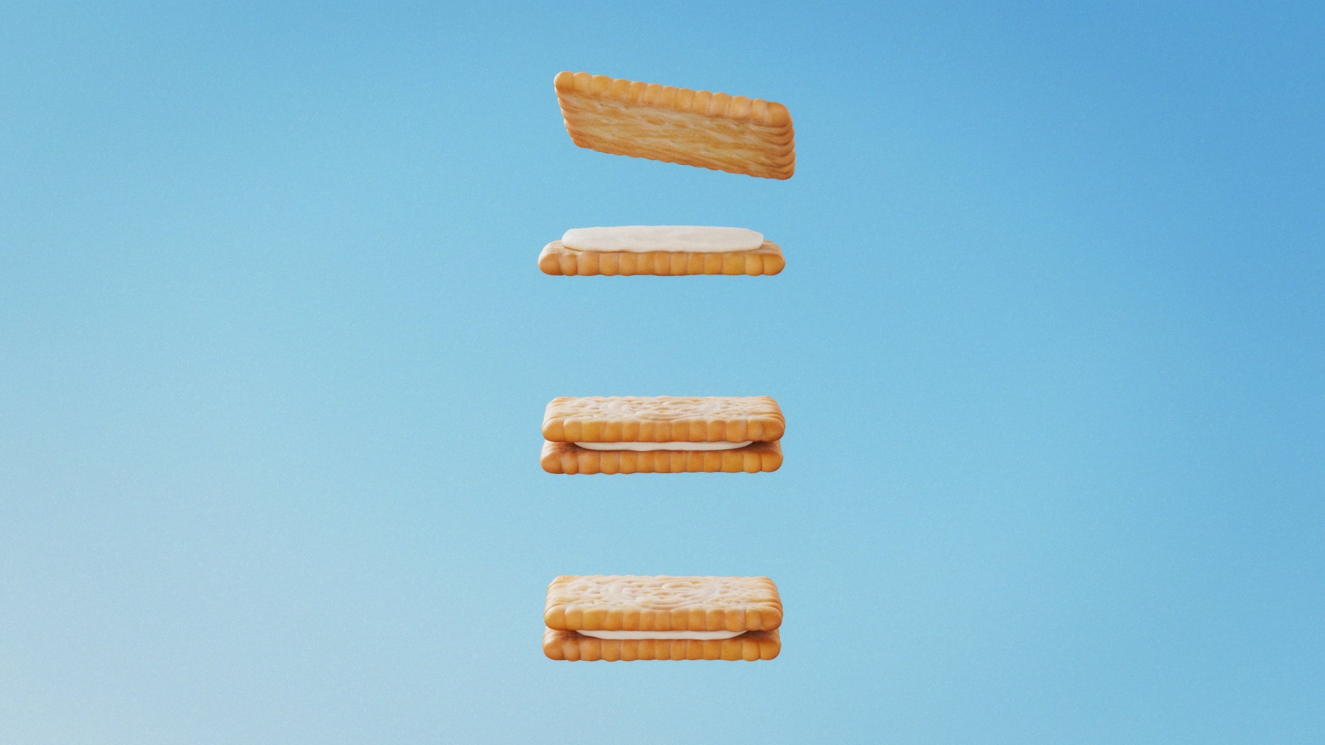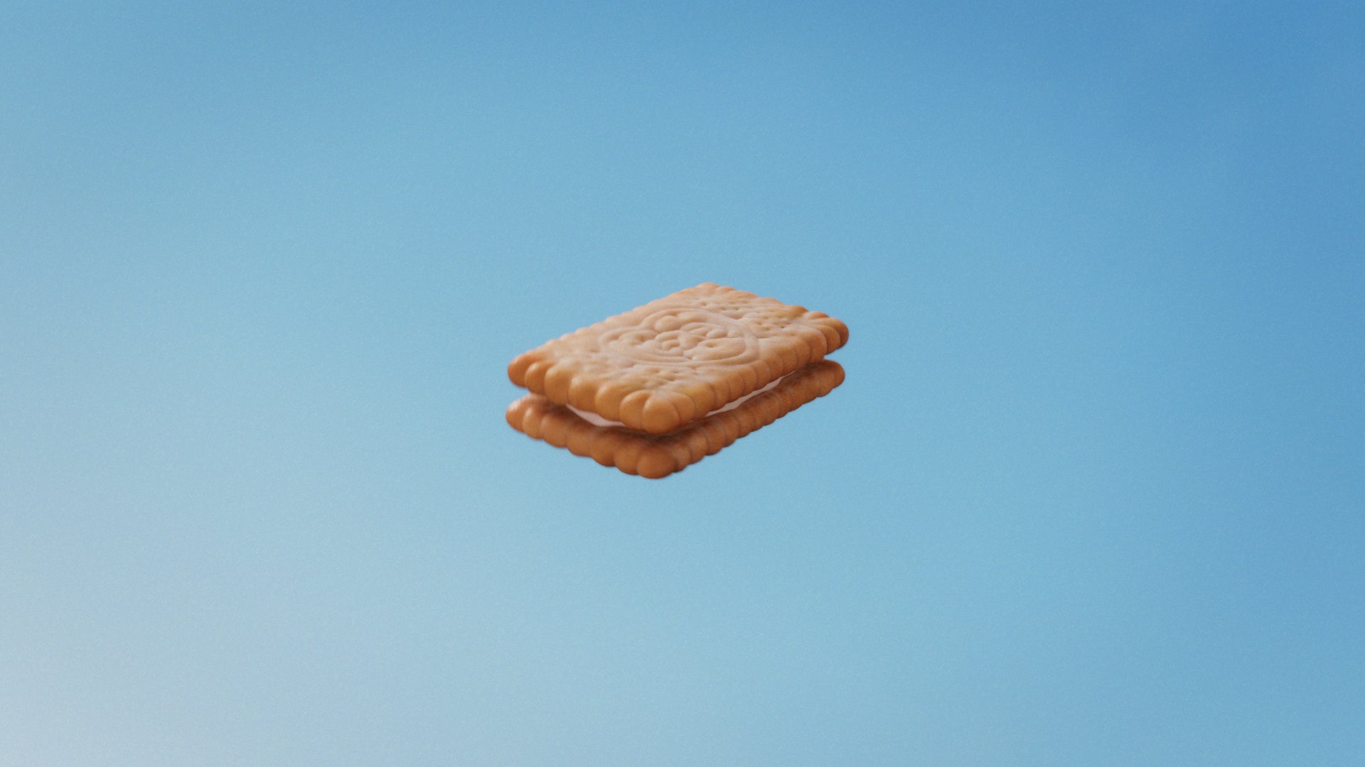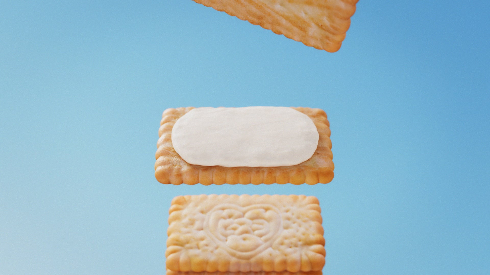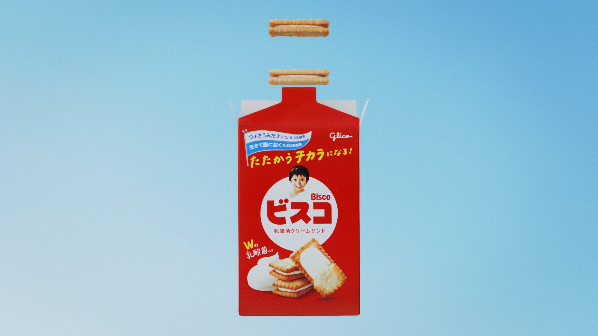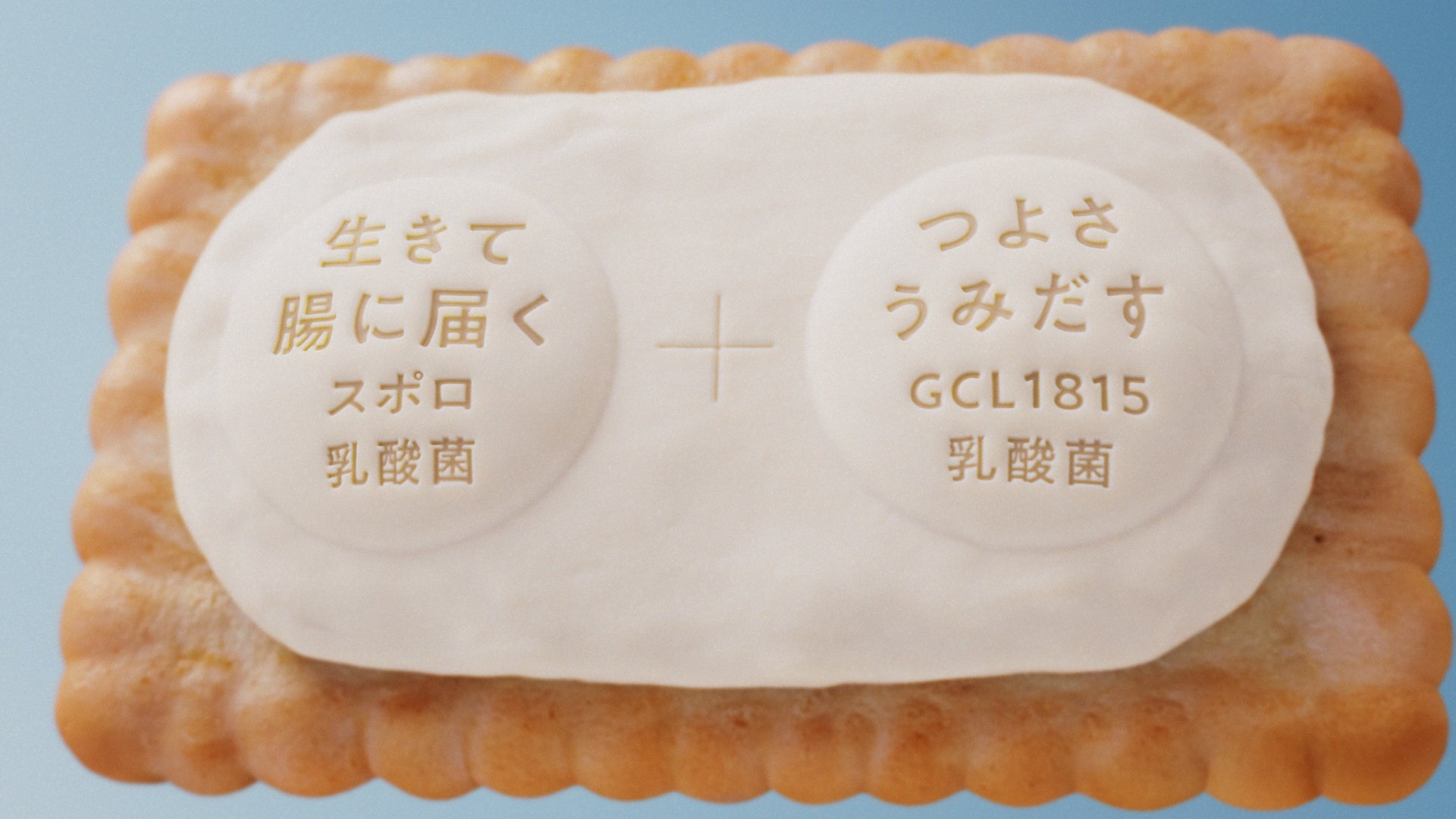 パッケージから現れた「ビスコ」が軽やかに動き出し、香ばしいビスケットとふんわりと重なるクリームが丁寧に映し出されます。クリームの中には「生きて腸に届くスポロ乳酸菌」と「つよさうみだすGCL1815乳酸菌」の2種類の乳酸菌がやわらかく浮かび上がり、「ビスコ」が持つ健康への思いを感じさせます。「愛がビスコをつよくした」というメッセージとともに、長く大切にしてきた思いを丁寧に描いています。