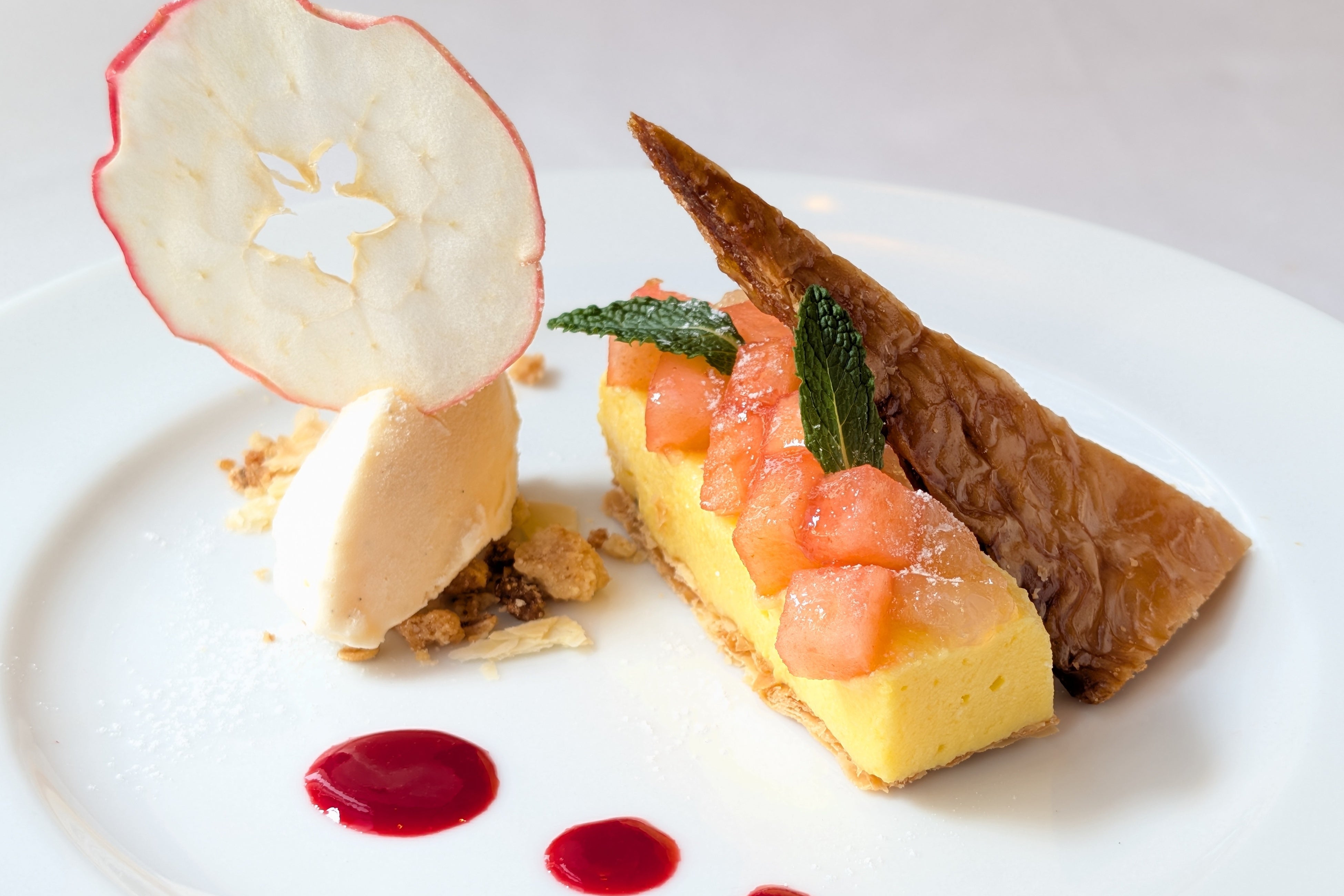大阪店では、軽やかな口どけのイタリアンメレンゲにアメリカらしくバーボンウイスキーの芳醇なカスタードに、爽やかな酸味のシードルのジュレや、果実の甘みを香りを引き立てるコンポート、リンゴのスライスチップをパイ生地と組み合わせた新感覚のアップルパイ「冷製アップルパイ」をご用意しました。アメリカの家庭で親しまれてきたアップルパイ文化に、どこか懐かしさを感じさせながらも、現代的に再構築し、口に運ぶごとに味わいと食感のコントラストが広がる一品です。
