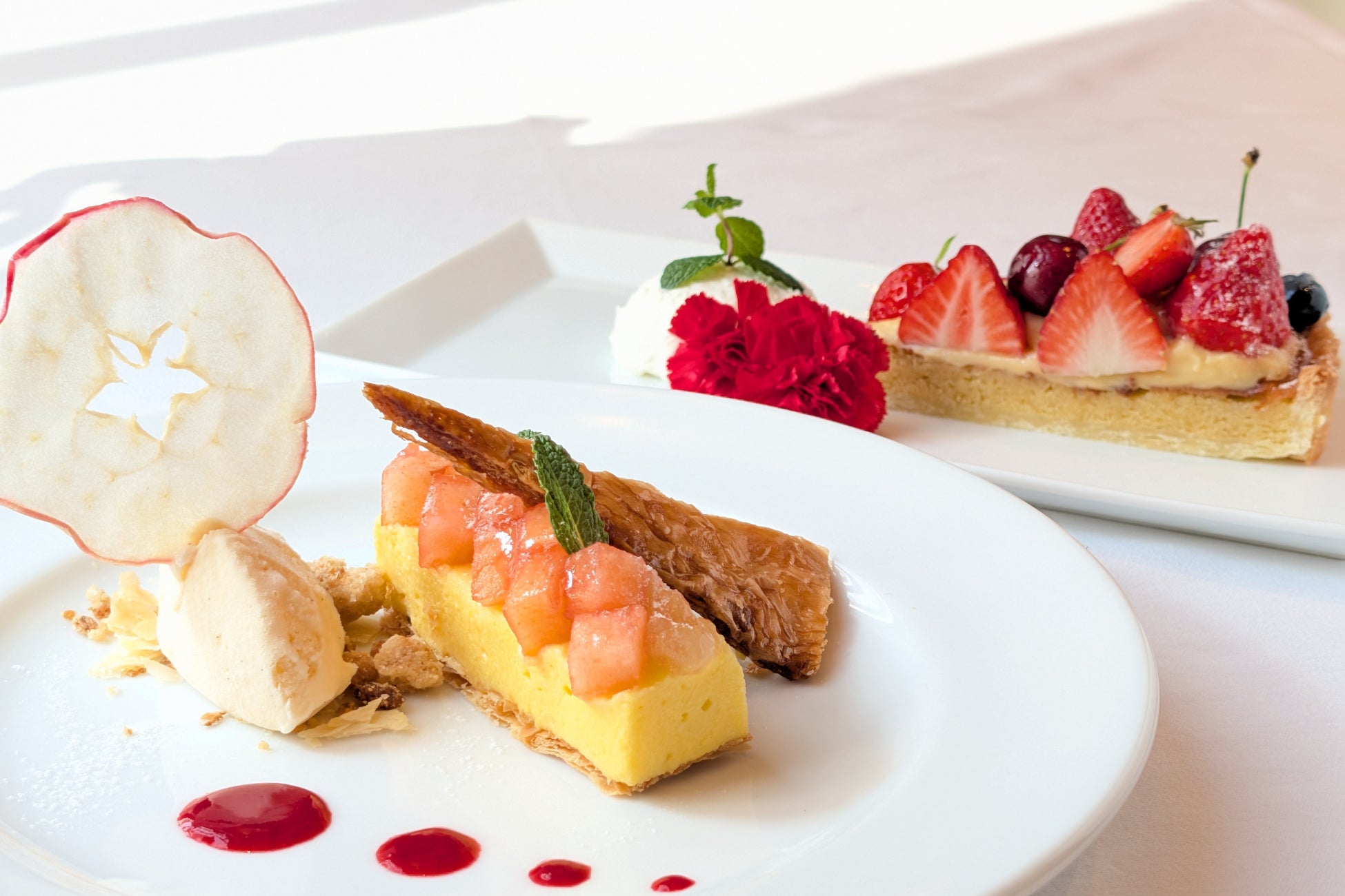 本企画では、母の日に寄せて、“お母様へ日頃の感謝の気持ちを、食後のひとときに込めて伝える”をテーマに、今回のデザートをご用意いたしました。ステーキコースの余韻を美しく締めくくる一皿として、味わいだけでなく記憶に残る時間を演出し、大切な方とのひとときをより豊かに彩ります。