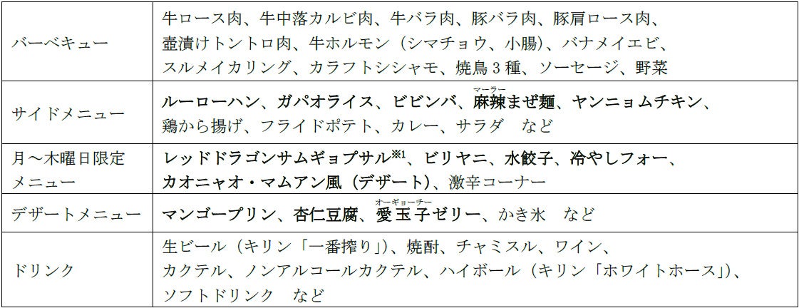 今年は時間無制限で、牛ロース肉や豚バラ肉、壺漬けトントロ肉、牛ホルモンなど8種類のお肉やシーフード、焼鳥3種類、野菜などのバーベキューメニューに加え、サイドメニューとして、台湾のルーローハンやタイのガパオライス、韓国のビビンバや中国の麻辣(マーラー)まぜ麺といったアジアンフードをご用意。ビールのあてに定番の鶏から揚げやフライドポテトなどもラインアップしています。さらに、月曜日から木曜日は、韓国のレッドドラゴンサムギョプサルや、インドのビリヤニ、中国の水餃子、ベトナムの冷やしフォーやタイのココナッツ風味のカオニャオ・マムアン風(デザート)などの限定メニューのほか、ハバネロ、カイエンヌペッパーなどをトッピングできる激辛コーナーも登場します。ドリンクは、生ビール、焼酎、チャミスル、ワイン、カクテル、ノンアルコールカクテルなど全27種類が飲み放題です。また、通常プランの他にも、佐賀牛や車海老、サザエが1皿追加でセットになった「プレミアムBBQプラン」もご用意しました。