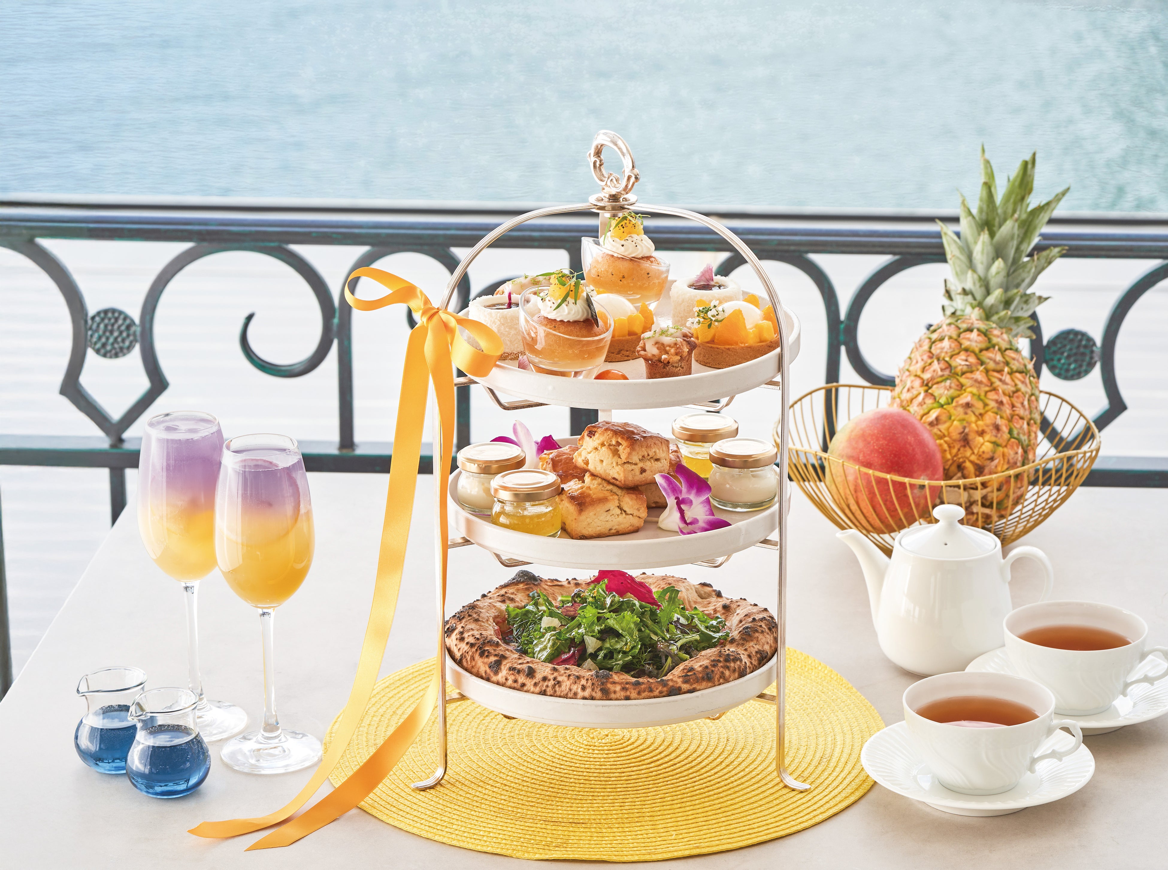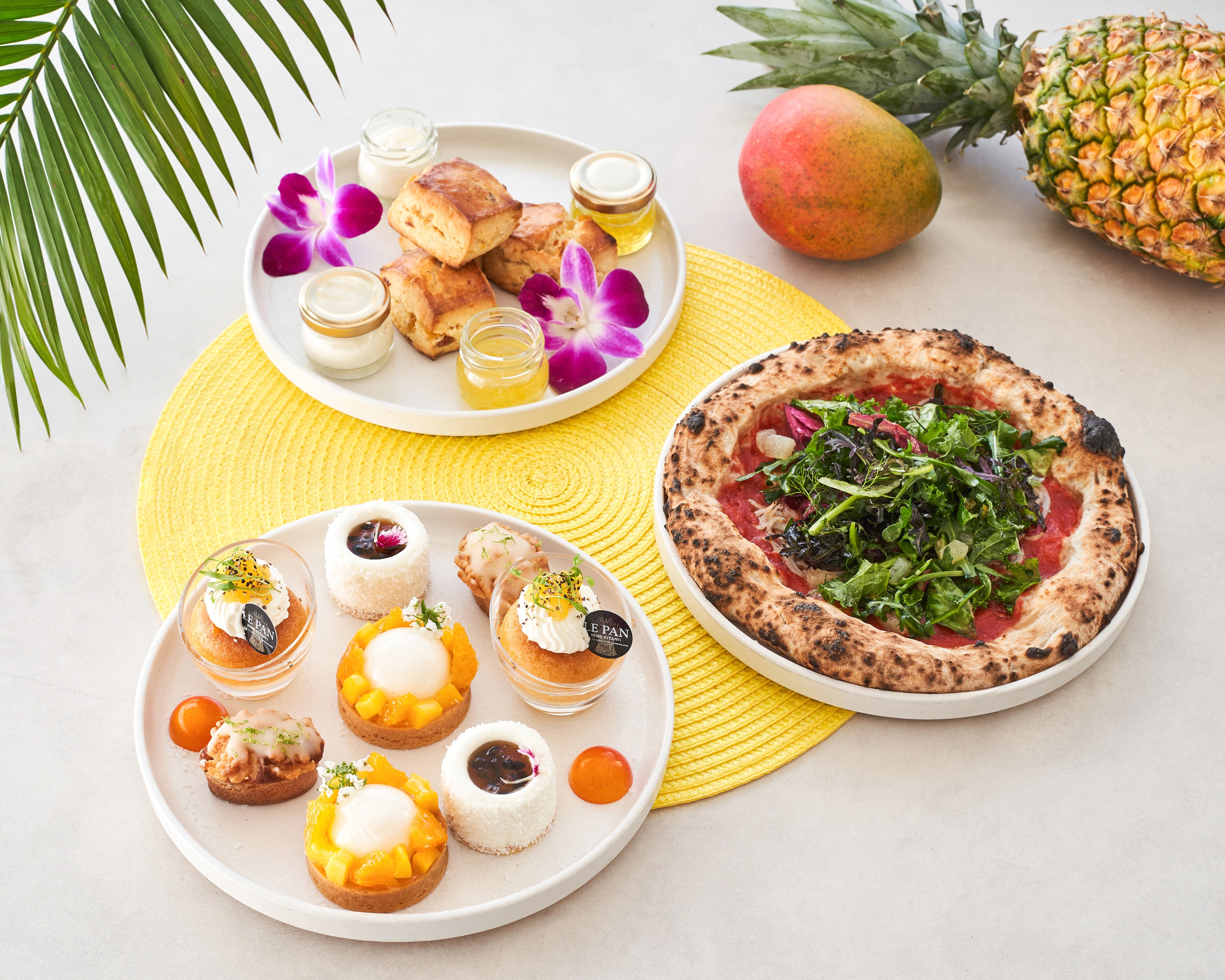 同店では、ティータイムに季節ごとで内容を変えるシーズナルアフタヌーンティーを展開。5月から7月にかけては、マンゴーやパイナップルなど南国フルーツをふんだんに使用した、彩り豊かなスイーツが登場いたします。さらに、ami神戸ならではの魅力が光る石窯焼きの本格ピッツァをセイボリーに取り入れ、夏の訪れを感じるラインアップに仕上げました。