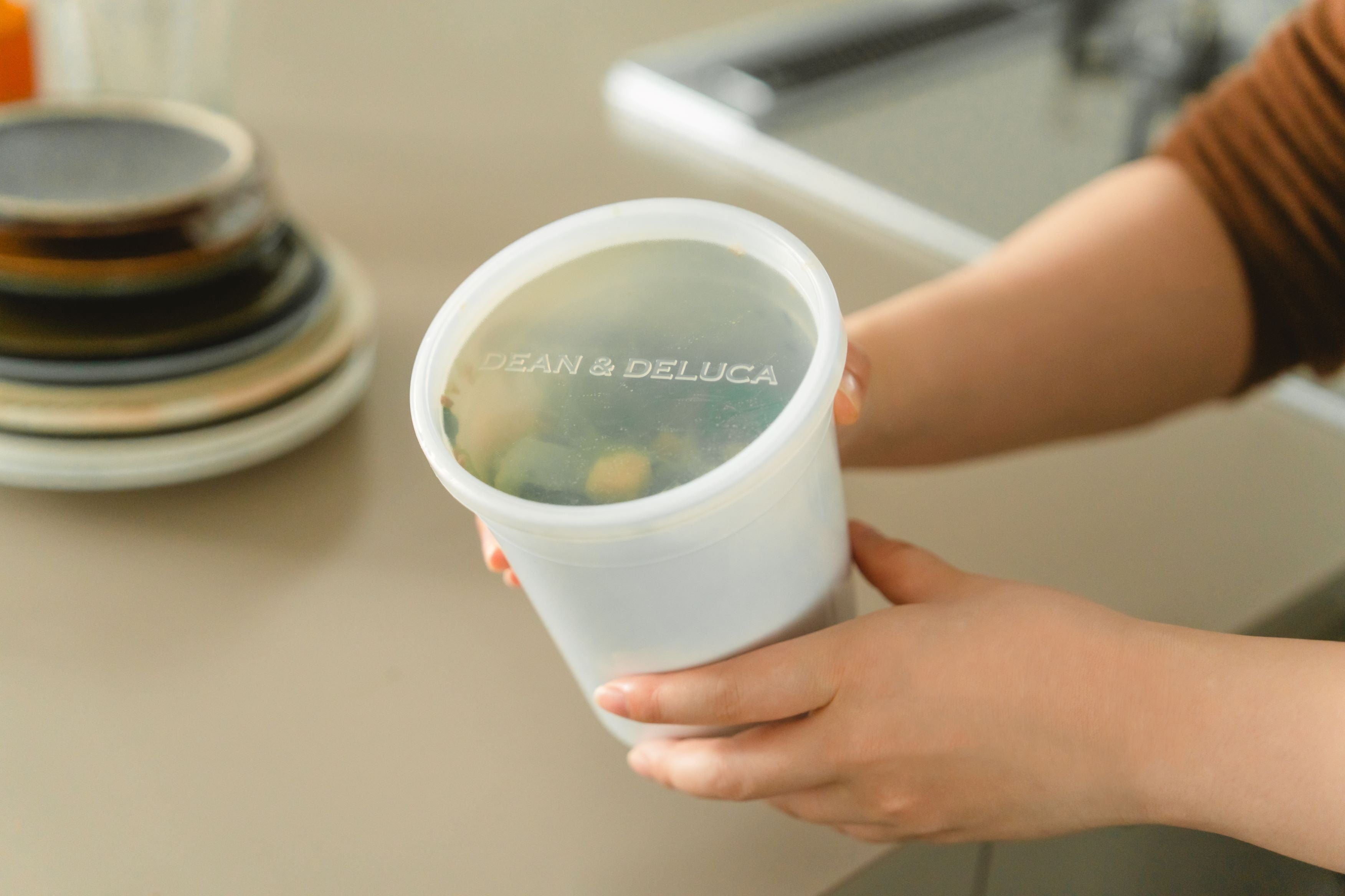 DEAN & DELUCAのフードコンテナは、高さのあるLサイズを採用し、振りやすさを重視しました。本体は電子レンジ対応で、手軽に温野菜も楽しめます。保存も持ち運びもできる万能容器です。