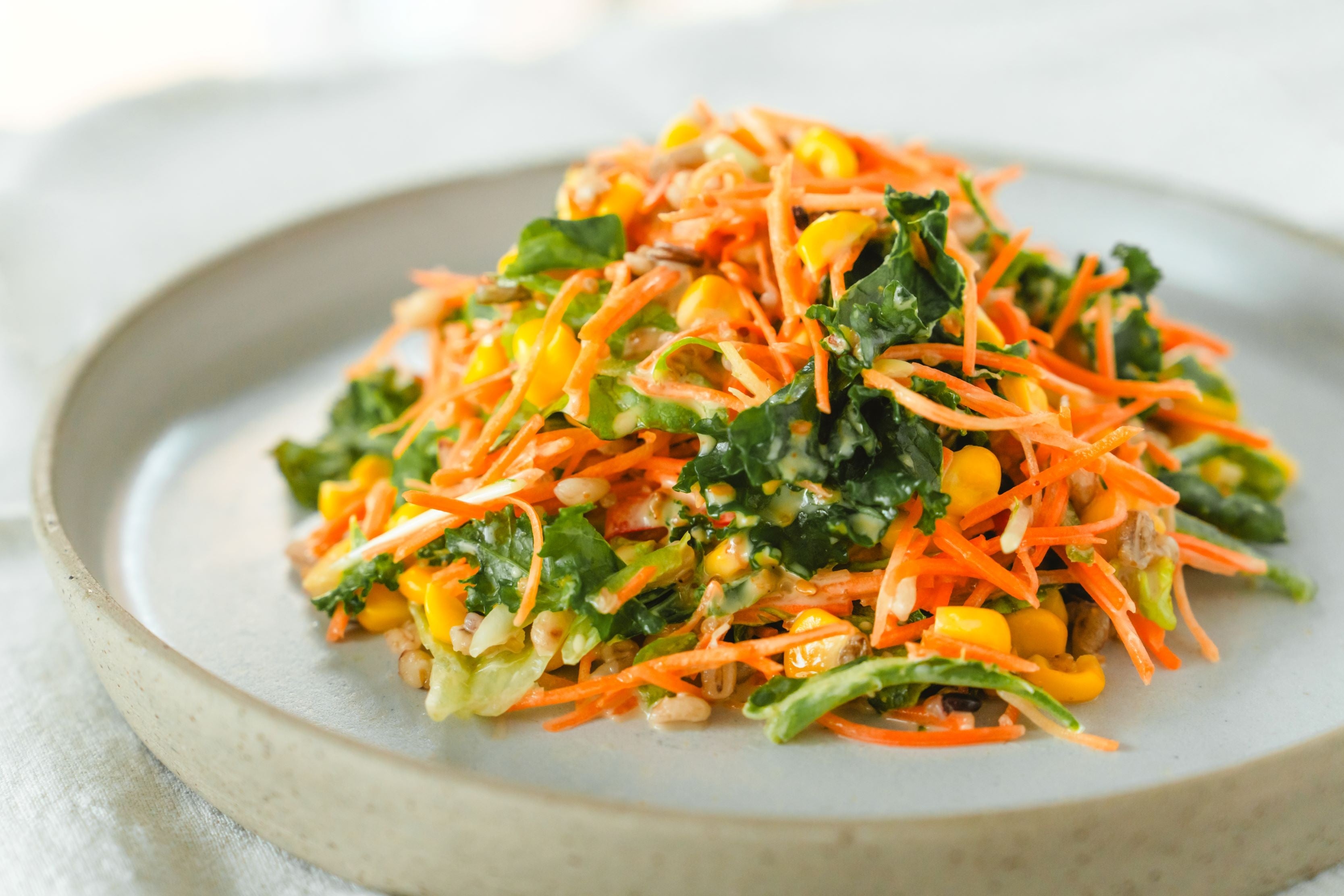 ケールなどの爽やかな野菜に、濃厚な焙煎胡麻ドレッシングが調和したバランスの良いサラダです。コーンの甘みや、もち麦ミックスのぷちぷちとした食感が、満足感を高めます。