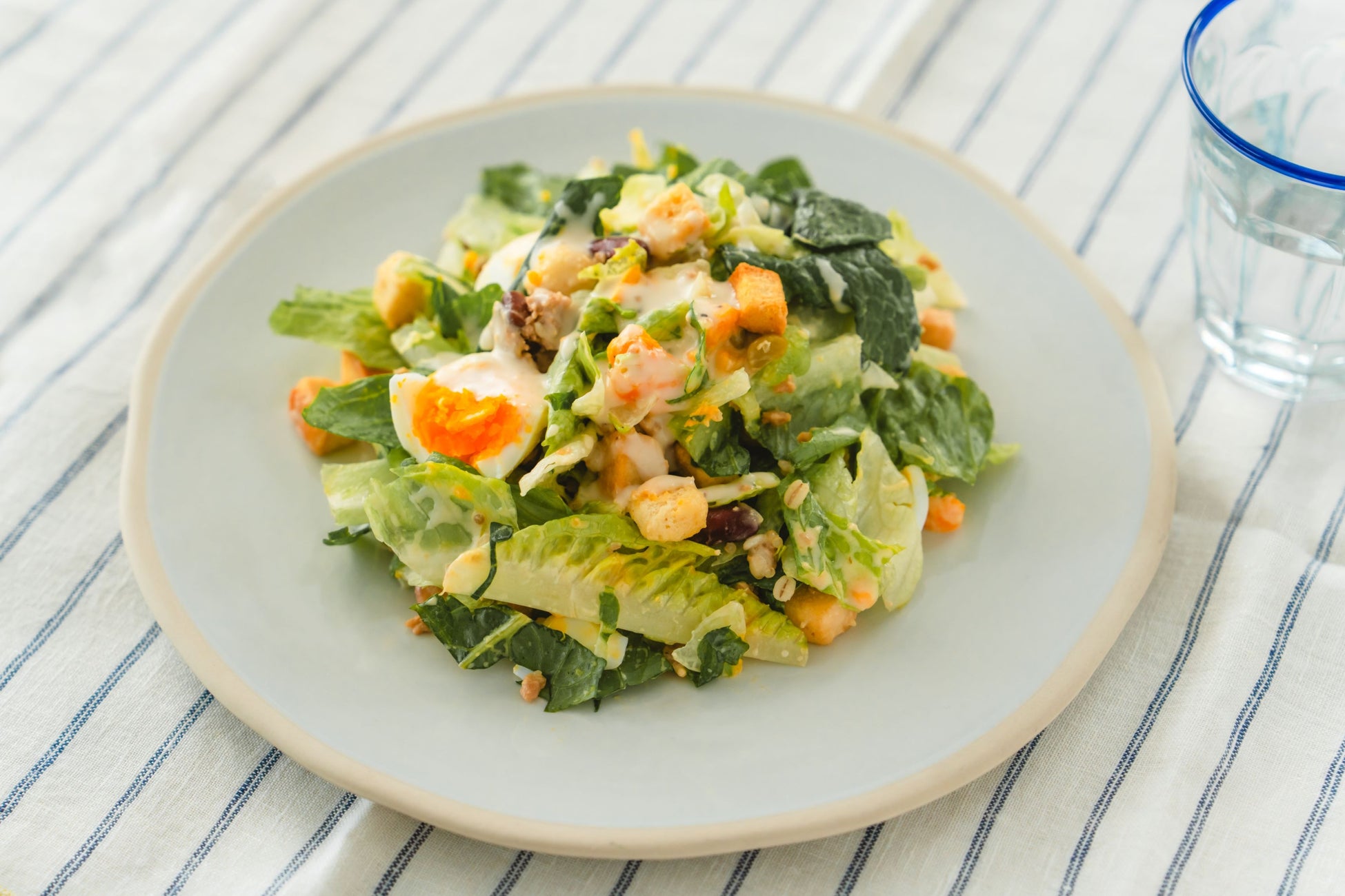 粗くつぶした「ゆでたま」に、クリーミーなドレッシングを合わせたボリューミーな一皿です。大豆ミートやミックスビーンズのうま味に、クルトンのサクサク感がアクセントになります。