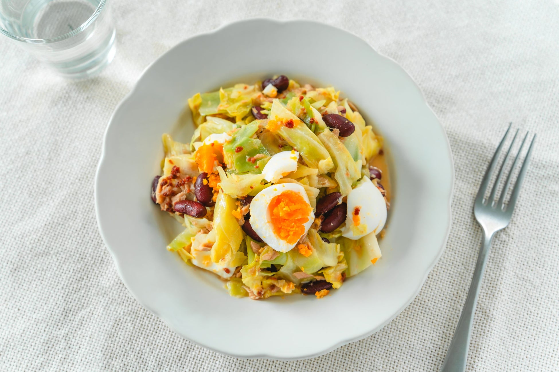 レンジで加熱して仕上げる、ツナのうま味が広がる温かいサラダです。レッドキドニー(赤いんげん豆)のほくほく感や、カリカリベーコンの風味が食欲をそそります。