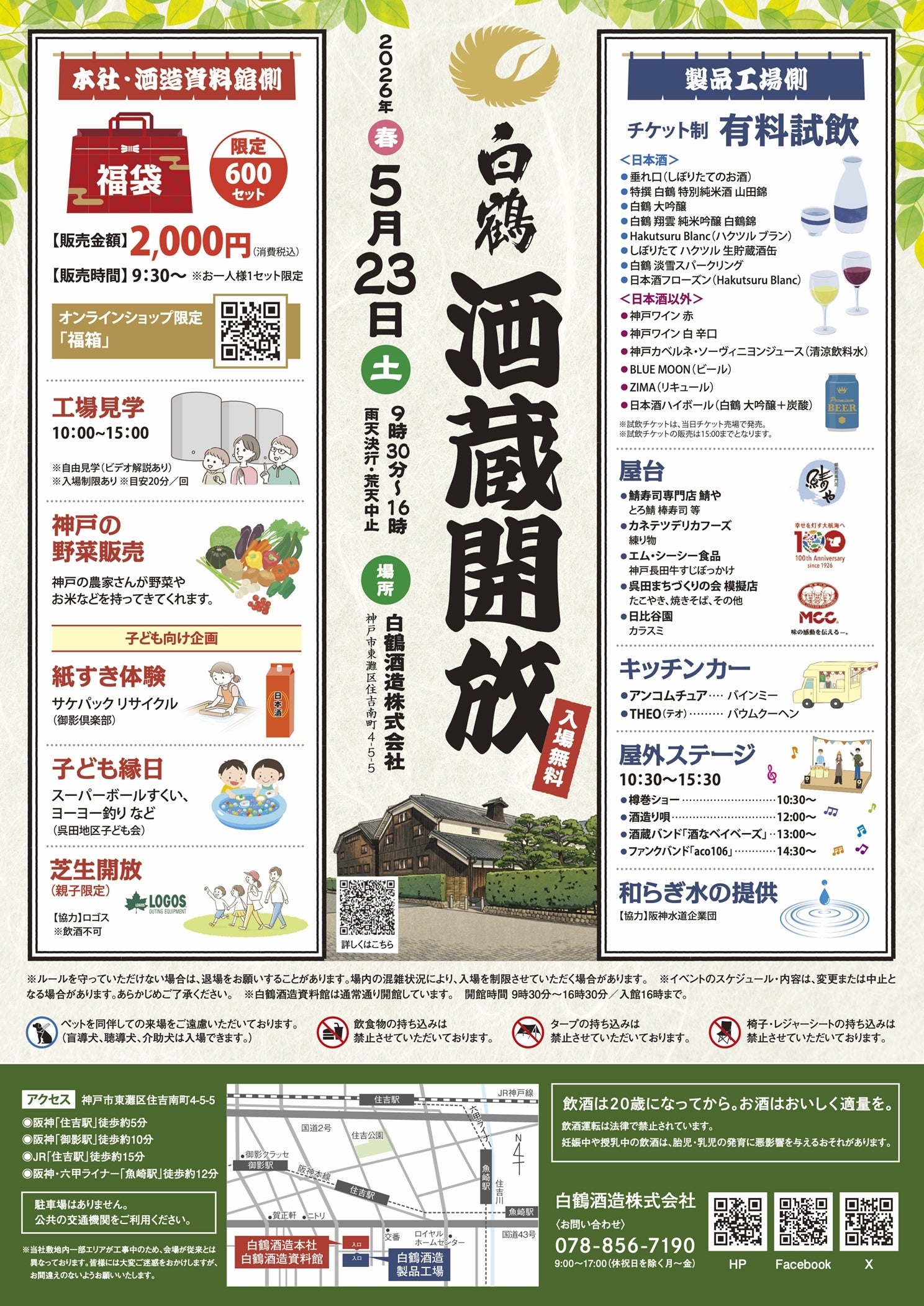白鶴酒造株式会社は、地域貢献と日本酒の需要開発、白鶴ブランドのPRを目的として2026年5月23日(土)に「白鶴2026年春『酒蔵開放』」を開催します。