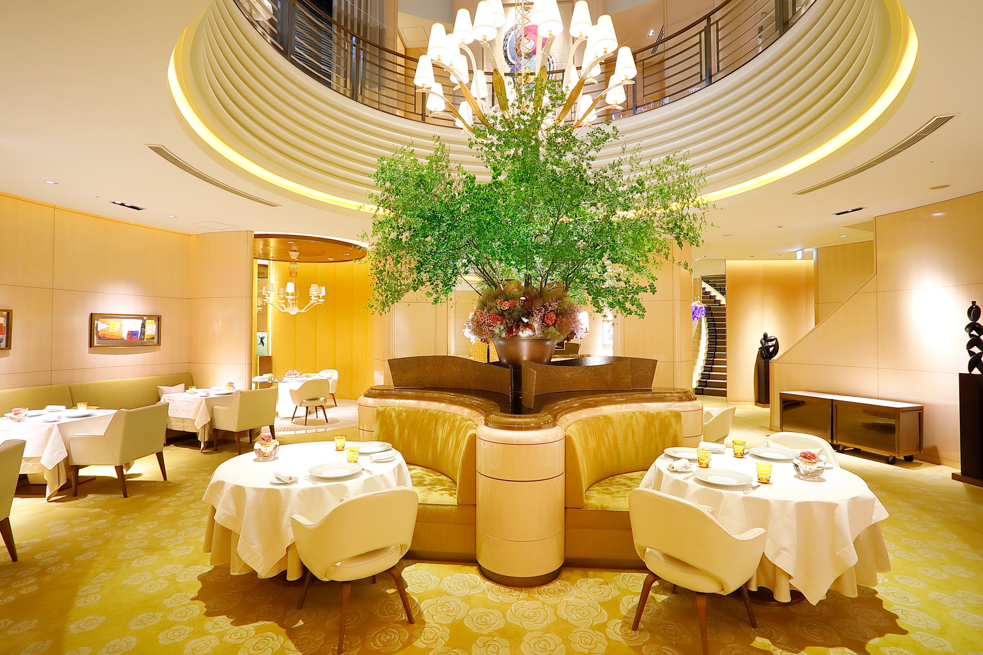 店内は「白」「ゴールド」「透明感」「ガラス」「光」をテーマに構成され、9メートルの吹き抜けと一体化したダイナミックな空間で、開放感とくつろぎに満ちた非日常の時間をお楽しみいただけます。サービスにおいてもスタッフの卓越したおもてなしが発揮され、国内外のお客様から高い評価を得ています。