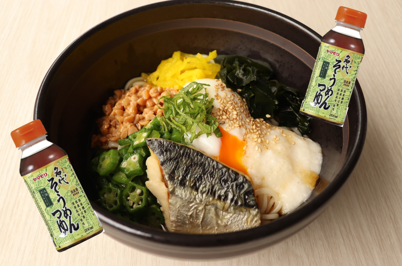 当社は今年の「乾麺グランプリ」アレンジメニュー部門に出品。メニュー名は「発売53年“名代つゆ”仕立!初夏の一杯 焼きサバばくだん麺」(以下、「焼きサバばくだん麺」)です。めんつゆを販売して53年のヤマモリの社員が、当社の歴史と技術を詰め込んで創作した自信作です。