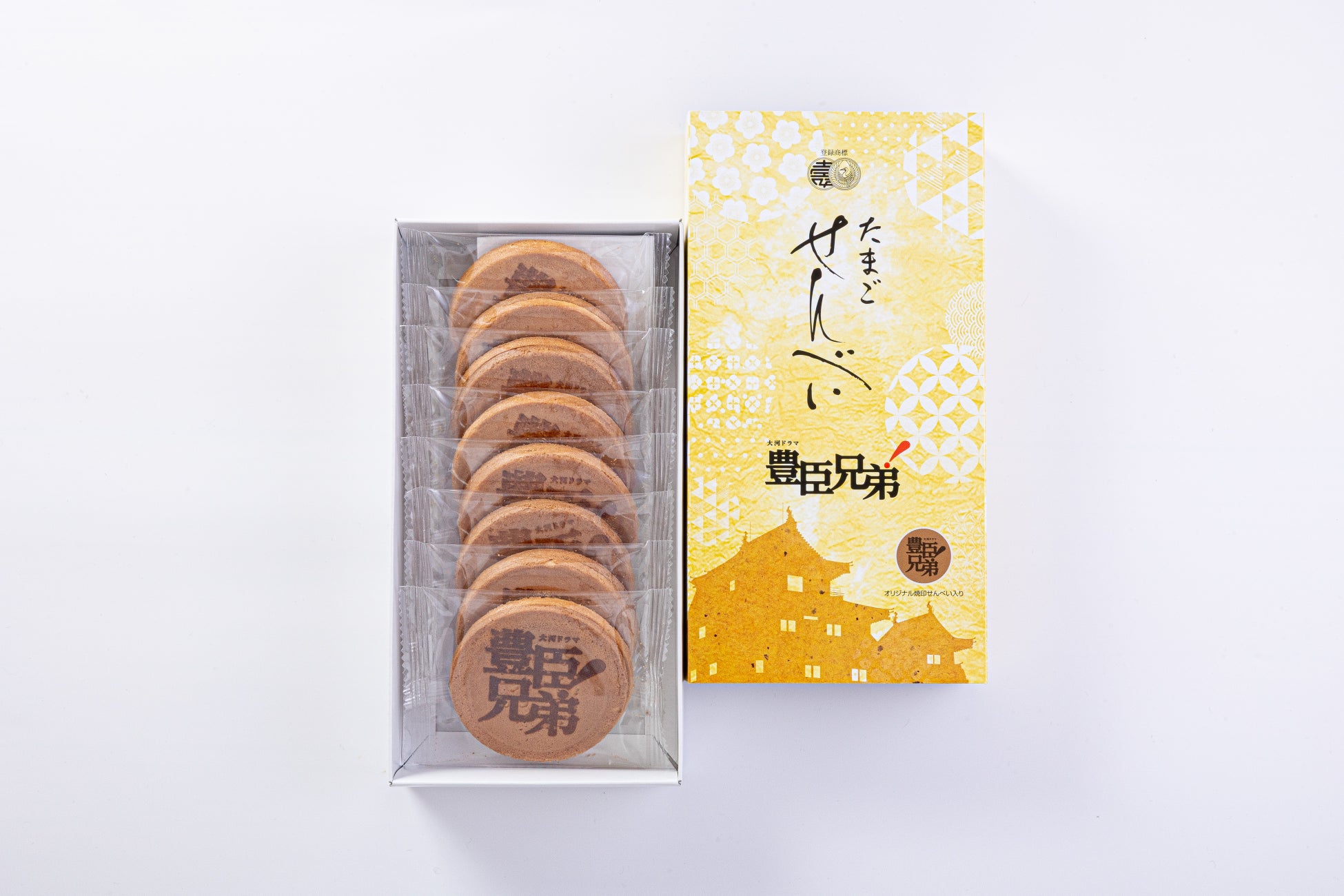 卵のやさしい甘さを活かした素朴でどこか懐かしい味わいが特長です。表面には大河ドラマ「豊臣兄弟!」のタイトルロゴを焼き印し、歴史の物語を感じさせる特別仕様としました。パッケージには、豊臣秀吉が弟・秀長に築かせた和歌山城をイメージしてデザインしました。手焼きならではの風合いと香ばしさが、作品の世界観をさりげなく彩ります。(税込972円)