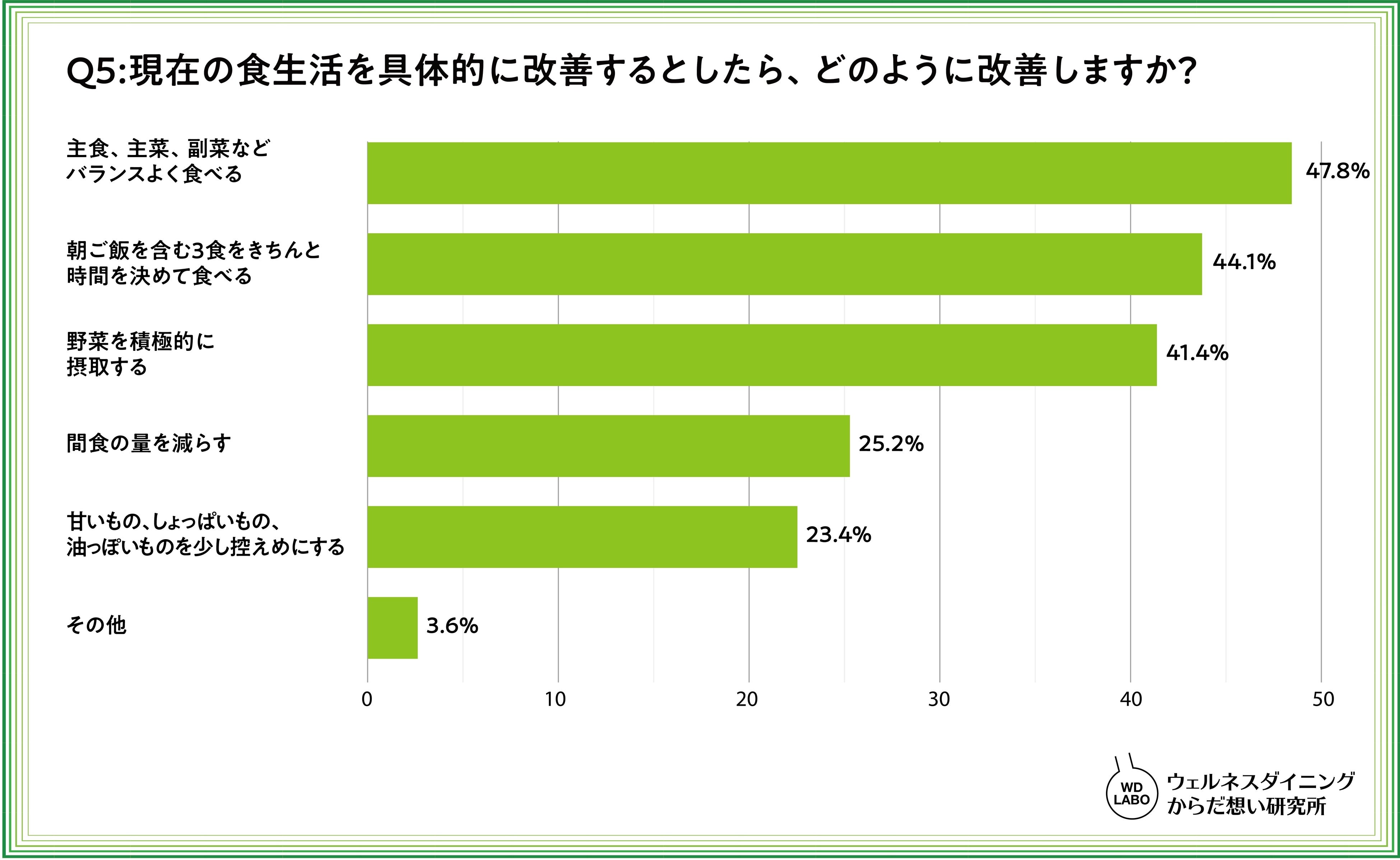 食生活の改善点として挙げられたのは、「ご飯、おかず、汁物など、色々なものをバランス良く食べるようにする」(47.8%)が最も多く、次いで「朝ごはんをちゃんと食べる、3食きちんと時間を決めて食べる」(44.1%)、「野菜を積極的に摂取する」(41.4%)と続き、多くの人が栄養バランスの取れた食事や、規則正しい食習慣の改善への意識が表れていた。