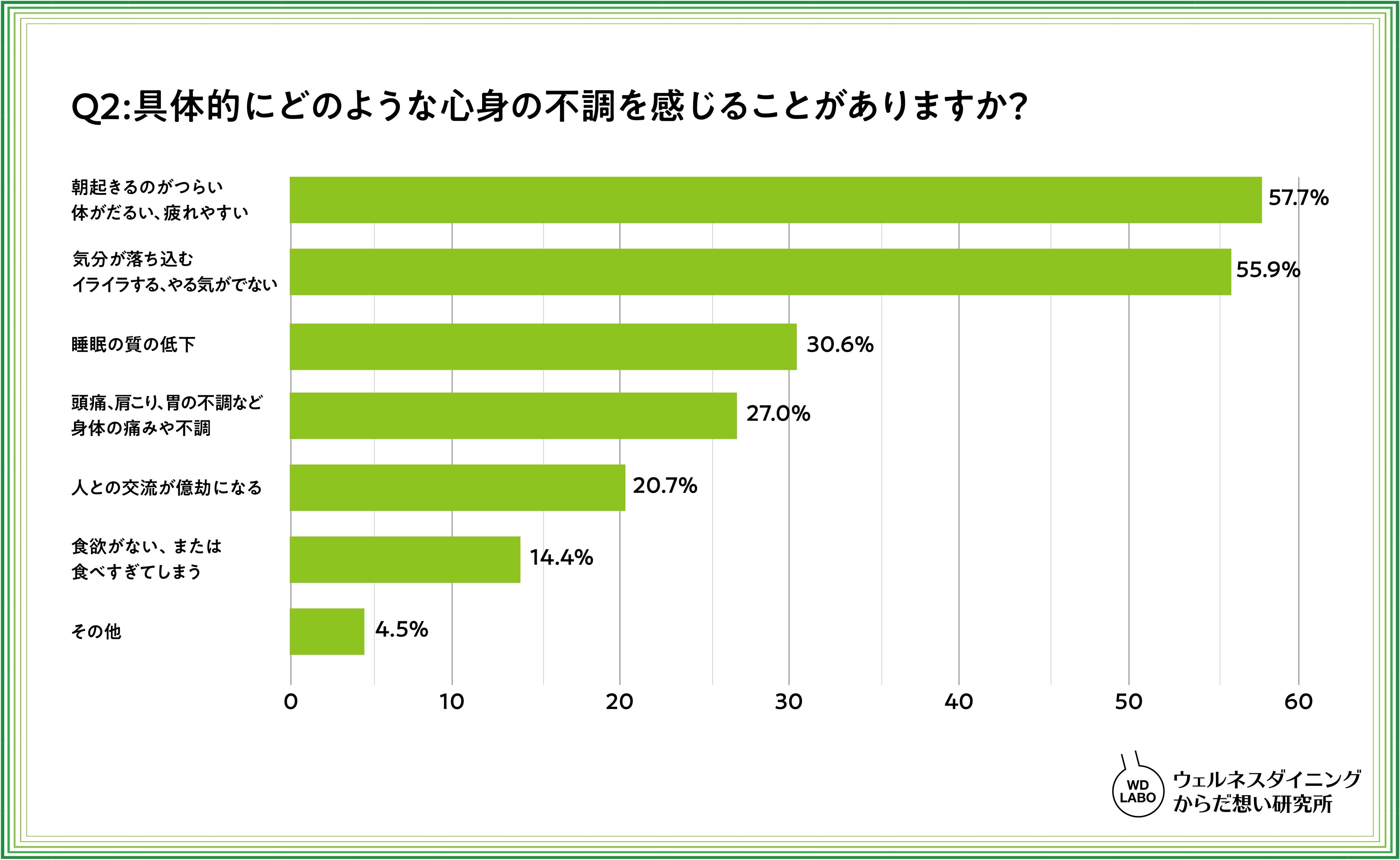 最も多かった不調は、「朝起きるのがつらい、体がだるい、疲れやすい」(57.7%)となり、次いで「気分が落ち込む、イライラする、やる気が出ない」(55.9%)であった。身体的な疲労感に加え、精神的な落ち込みも顕著であり、心身ともに不調を感じる人が多いことがわかる。