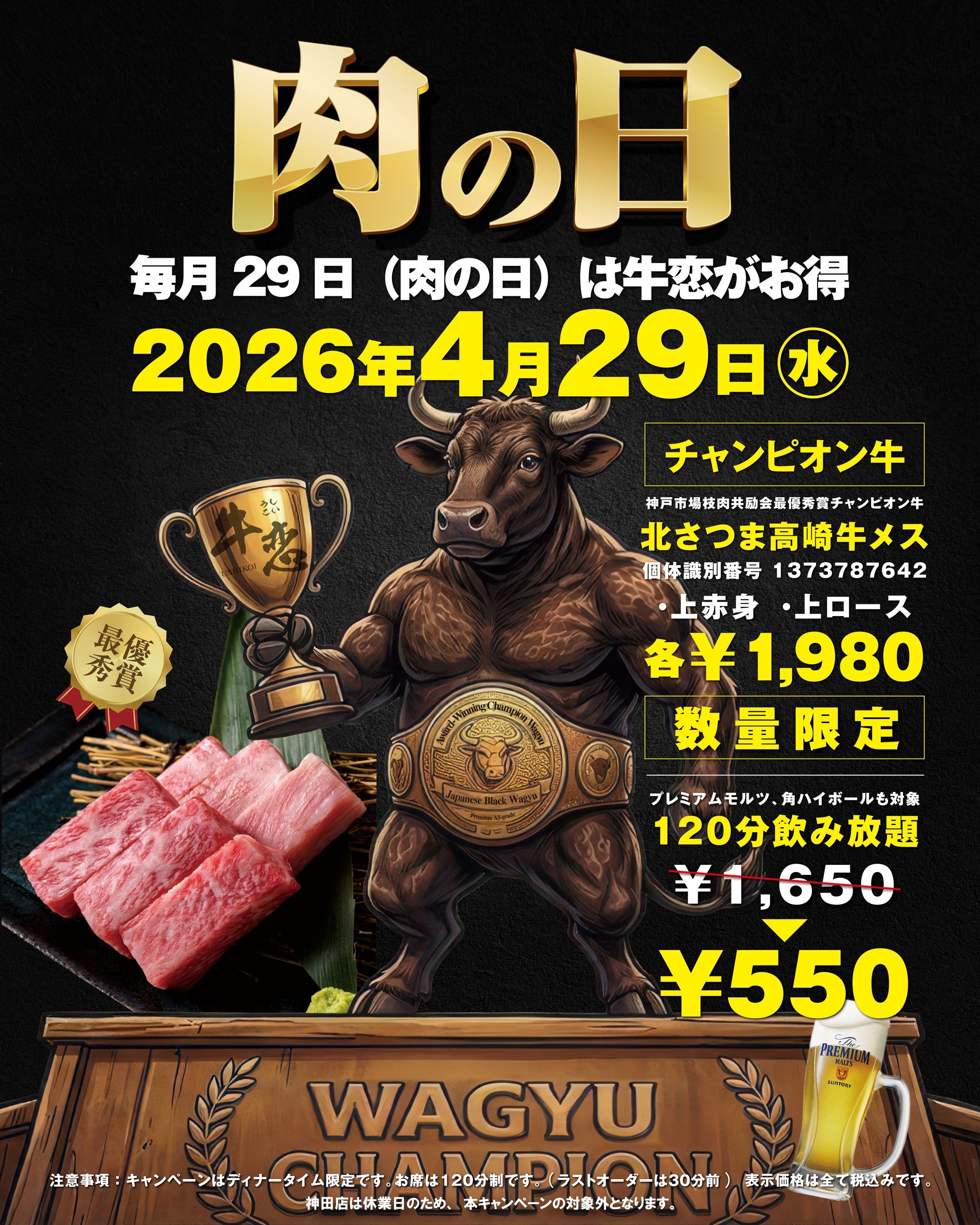 芸能人をはじめ多くの肉好きを魅了する焼肉店『牛恋』は、2026年4月29日(水・祝)の「肉の日」キャンペーン特別回にて、神戸市場枝肉共励会最優秀賞チャンピオン牛を数量限定で提供いたします。