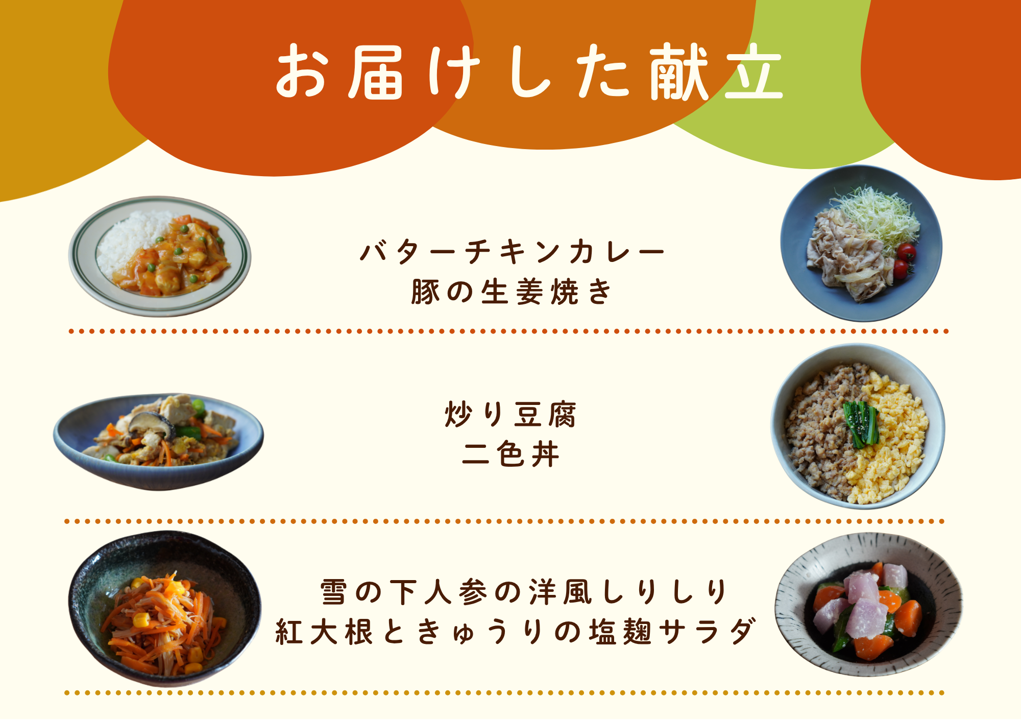今回のランチ会では、全6品の手作りお惣菜を提供しました。メニューは、「バターチキンカレー」「豚の生姜焼き」「炒り豆腐」「2色丼」に加え、北海道洞爺湖の《佐々木ファーム》さん