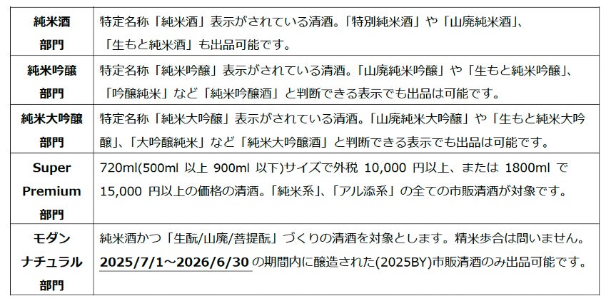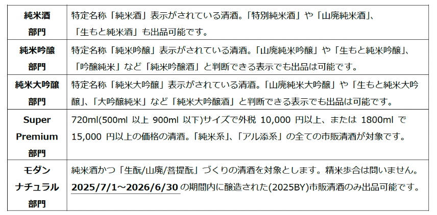 純米酒 部門・純米吟醸 部門・純米大吟醸 部門・Super Premium部門・モダンナチュラル 部門の全5部門で審査を行います。各部門の出品基準はラベル表記を基本としますが、ホームページなどで確認できる場合でも出品可能です。2025年7月1日から2026年6月30日までの期間に販売実績があるか、または販売予定のある清酒に限ります。販売予定商品につきましては、2026年4月10日までに発売日に関わらず、「商品名」や「ラベル」などの外見を含めて完成していることが出品の条件です。