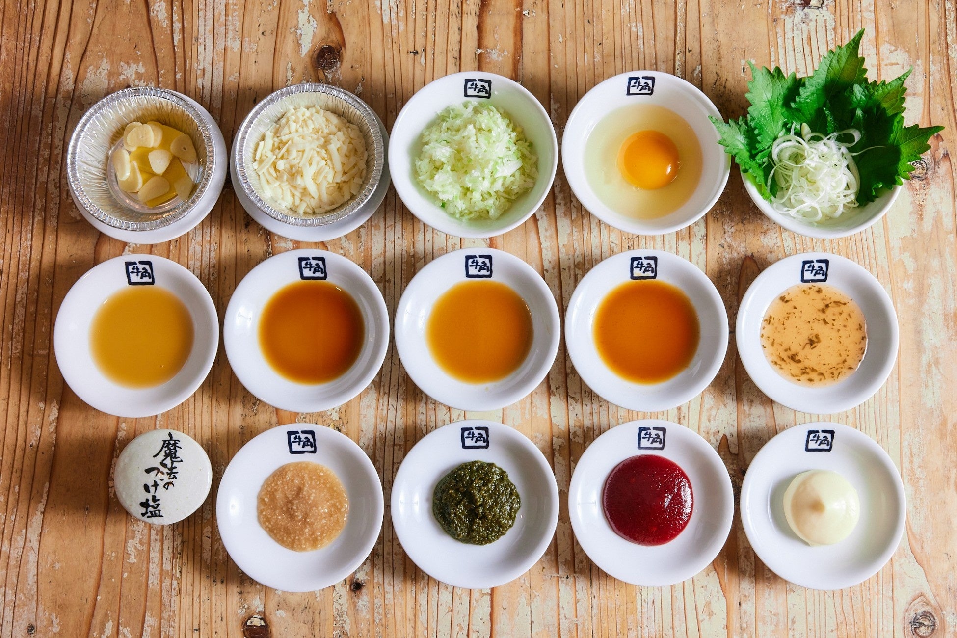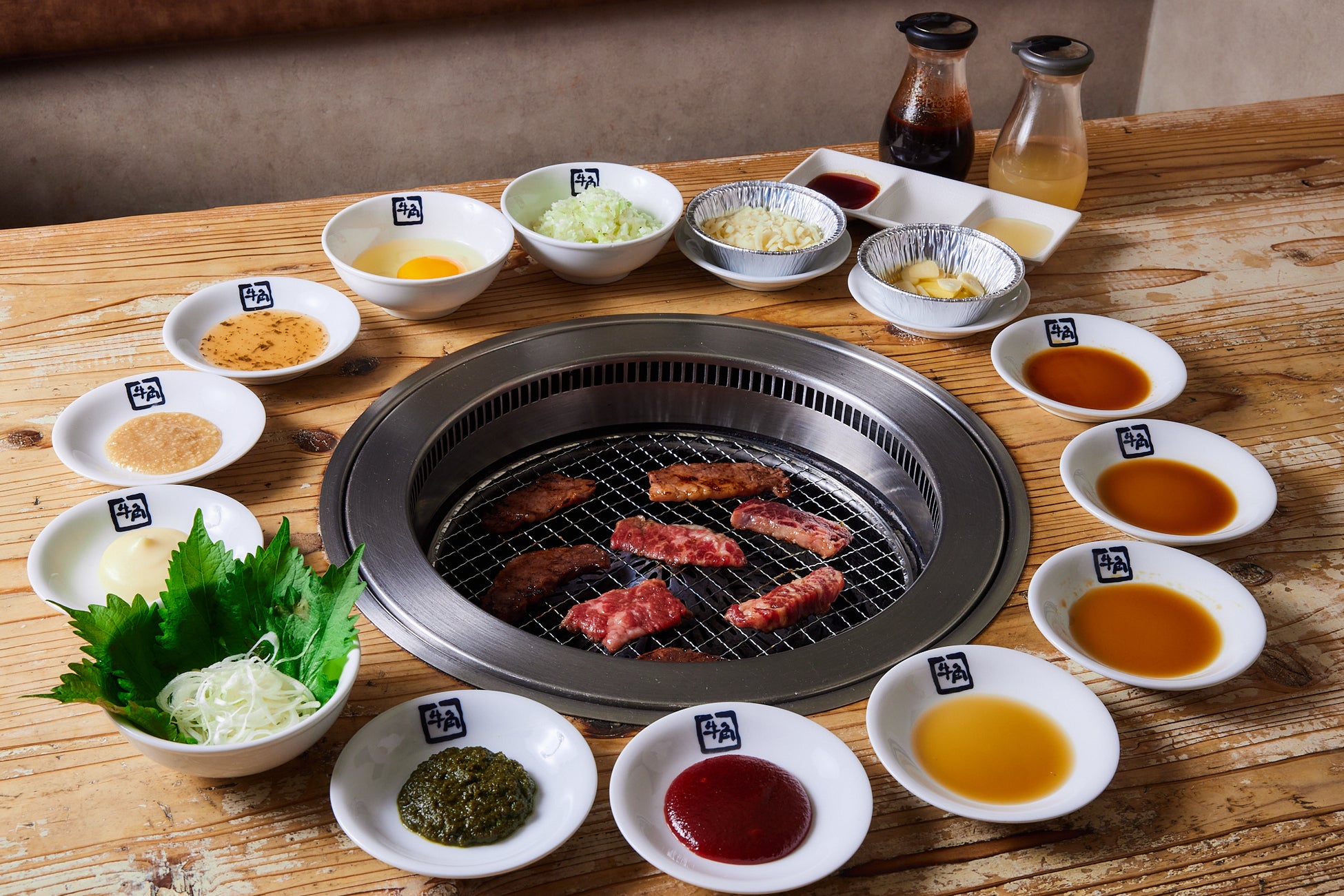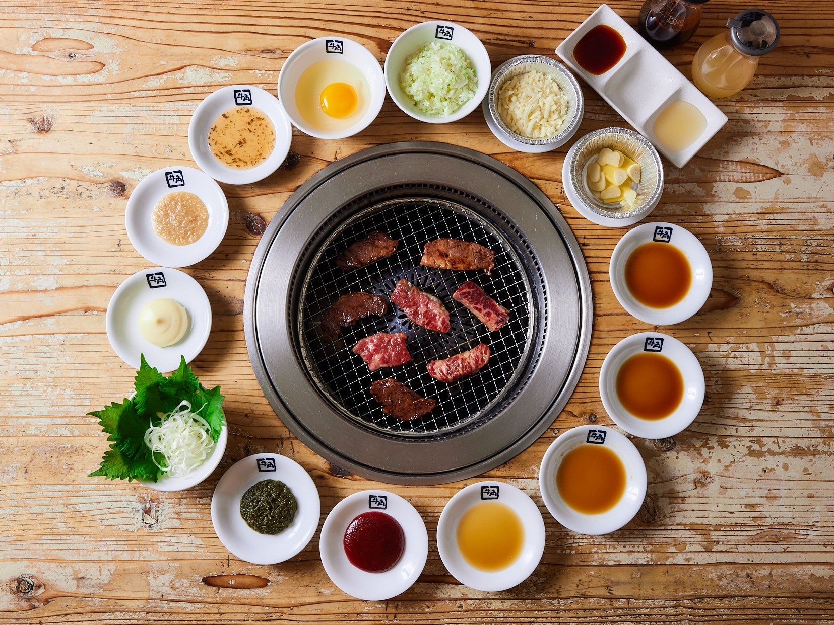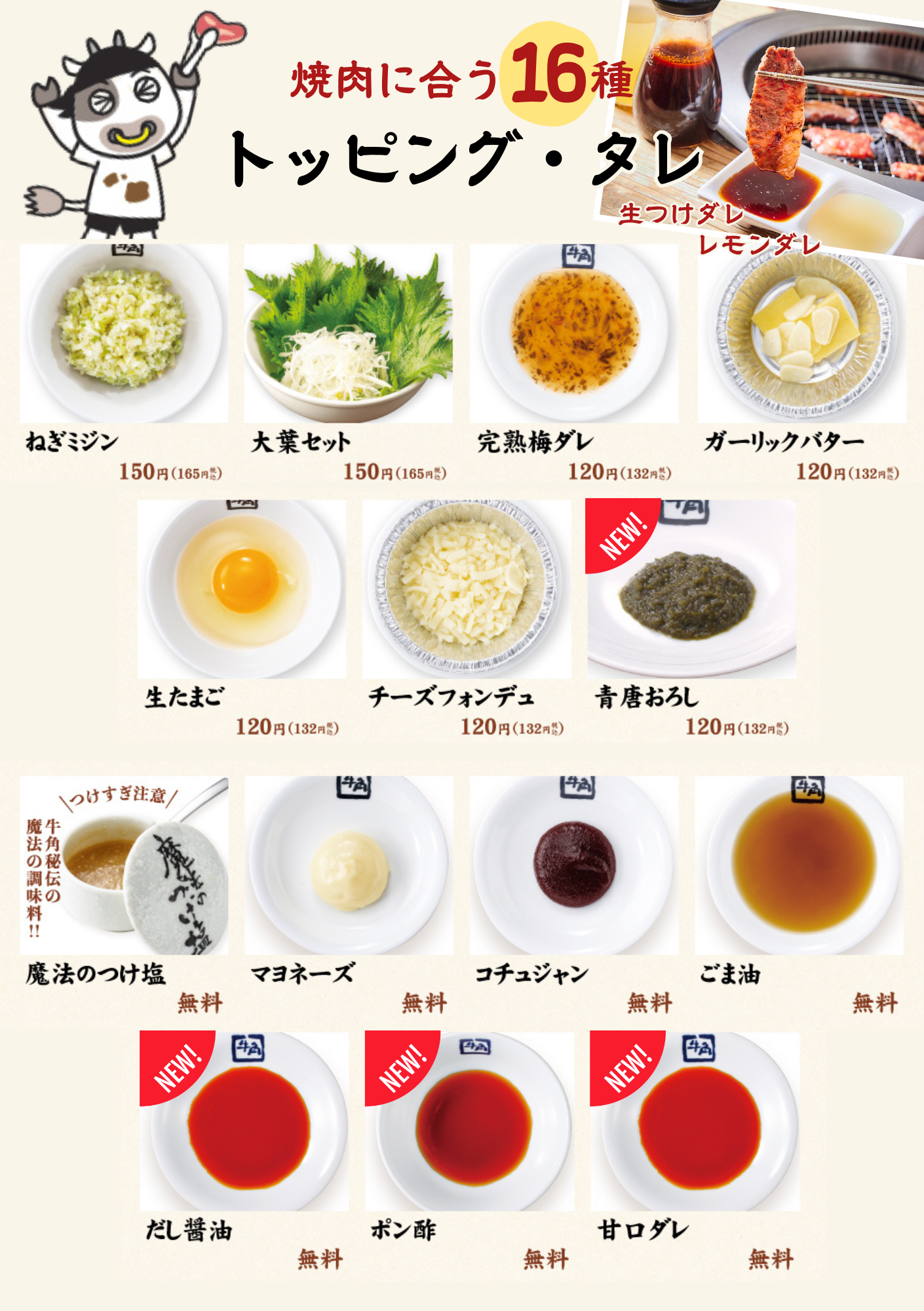 今回のリニューアルでは、牛角こだわりの「生つけダレ(卓上のタレ)」を起点に、途中で味わいを変化させながら焼肉を楽しめるよう、トッピングおよびタレのバリエーションを強化しました。まずは生つけダレで。その後は味変を重ねながら、時間いっぱい焼肉を楽しめる構成としています。卓上の生ダレやレモンを含め、全16種の組み合わせで焼肉をお楽しみいただけます。