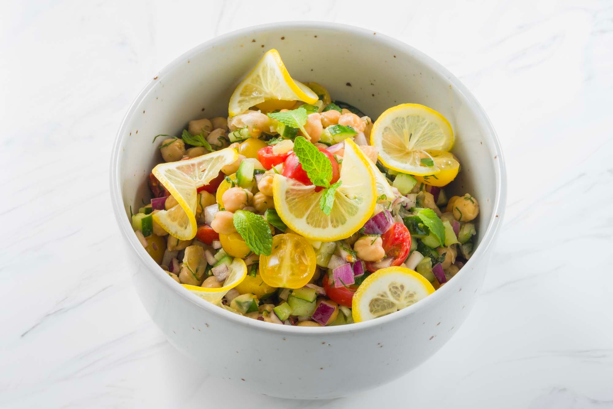 香り高いスパイスと爽やかな酸味が特徴の、インドの伝統的な前菜「インド風ひよこ豆のサラダ」。ほくほくとした食感のひよこ豆に、フレッシュな玉ねぎやトマト、きゅうりを合わせ、クミンやコリアンダーなどのスパイス、レモン果汁でさっぱりと仕上げました。