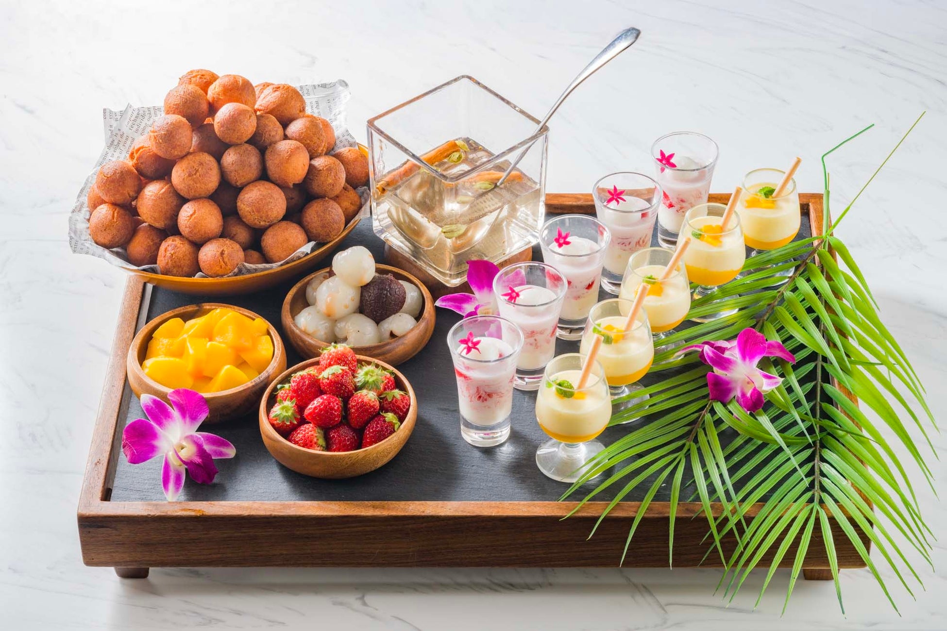 「世界一甘いお菓子」といわれている丸いドーナツのようなグラブジャムンをはじめ、お客様の前でしあげるマンゴーラッシーやライチシャーベットをトッピングしたファールーダーなどめずらしいデザートの品々をお楽しみください。