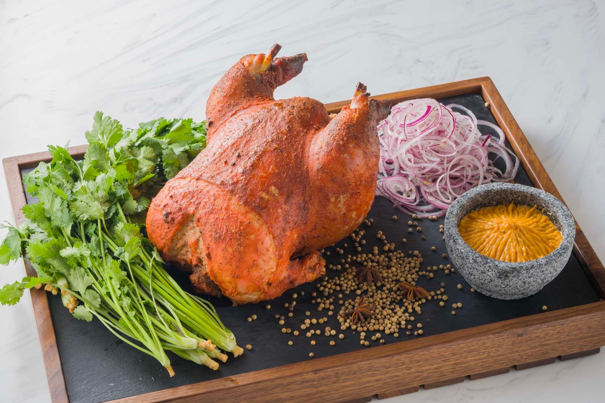 インドを代表する伝統料理「タンドリーチキン」。ヨーグルトと数種のスパイスにじっくりと漬け込んだ丸鶏を、高温で焼き上げることで、外は香ばしく、中は驚くほどジューシーな食感を実現しています。