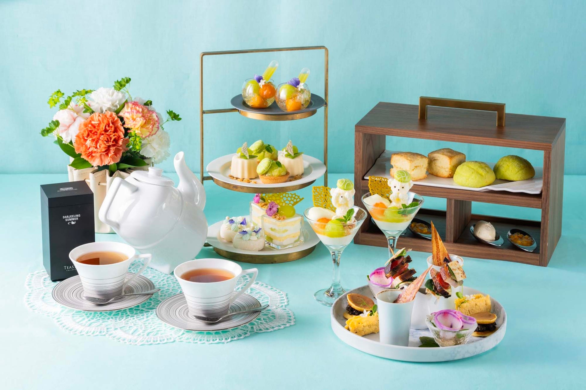 みずみずしいメロンを主役に、爽やかな甘さと北海道産乳製品のコクを生かしたアフタヌーンティーをご用意しました。エルダーフラワーやミントが香るスイーツ、メロンのクッキー帽をかぶった
