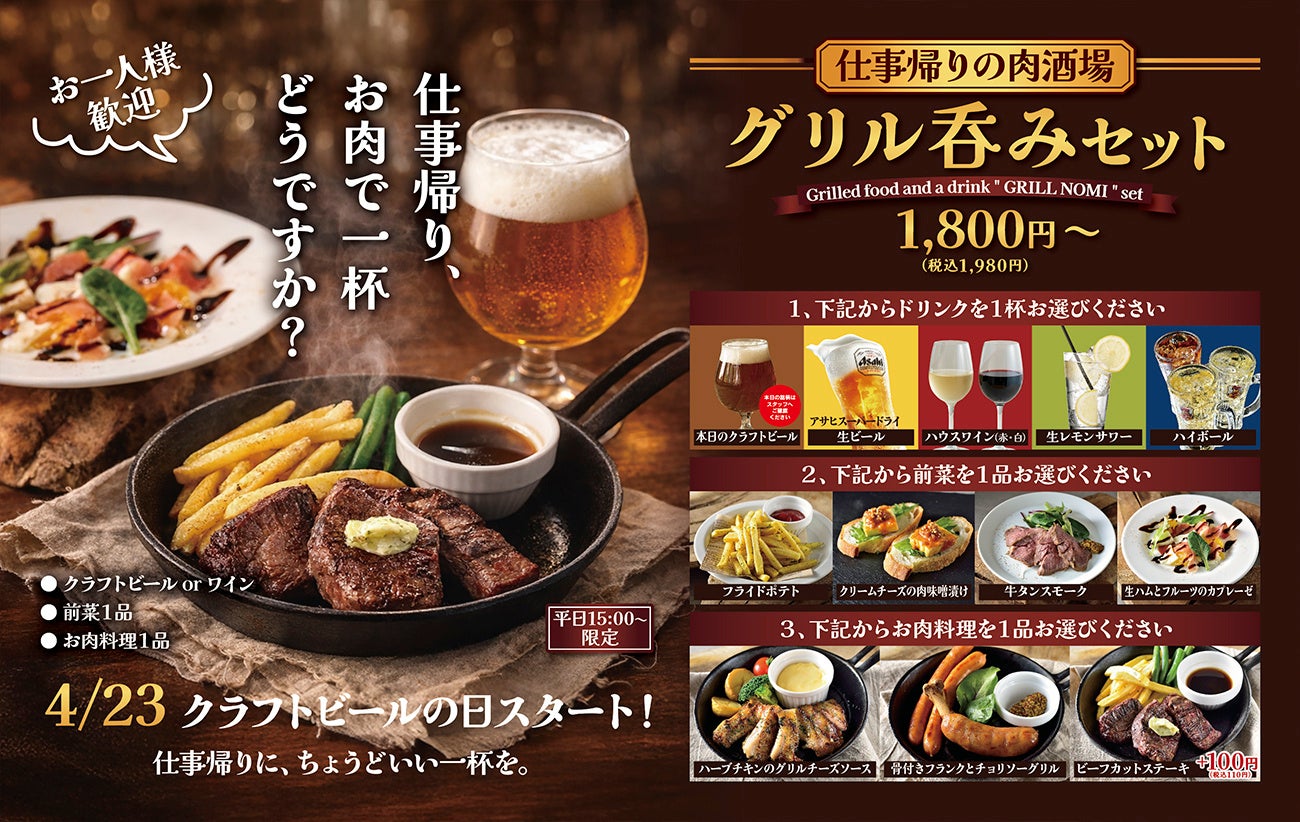 焼肉、洋食、インド料理など34店舗の飲食店を展開する株式会社 榮林(所在地:東京都新宿区、社長:金原東憲)は、東京 多摩エリアにある『なかのグリル昭島モリタウン店』にて、2026年4月23日より新たな利用シーンを提案する「仕事帰りの肉酒場!グリル呑みセット」の販売を開始いたします。