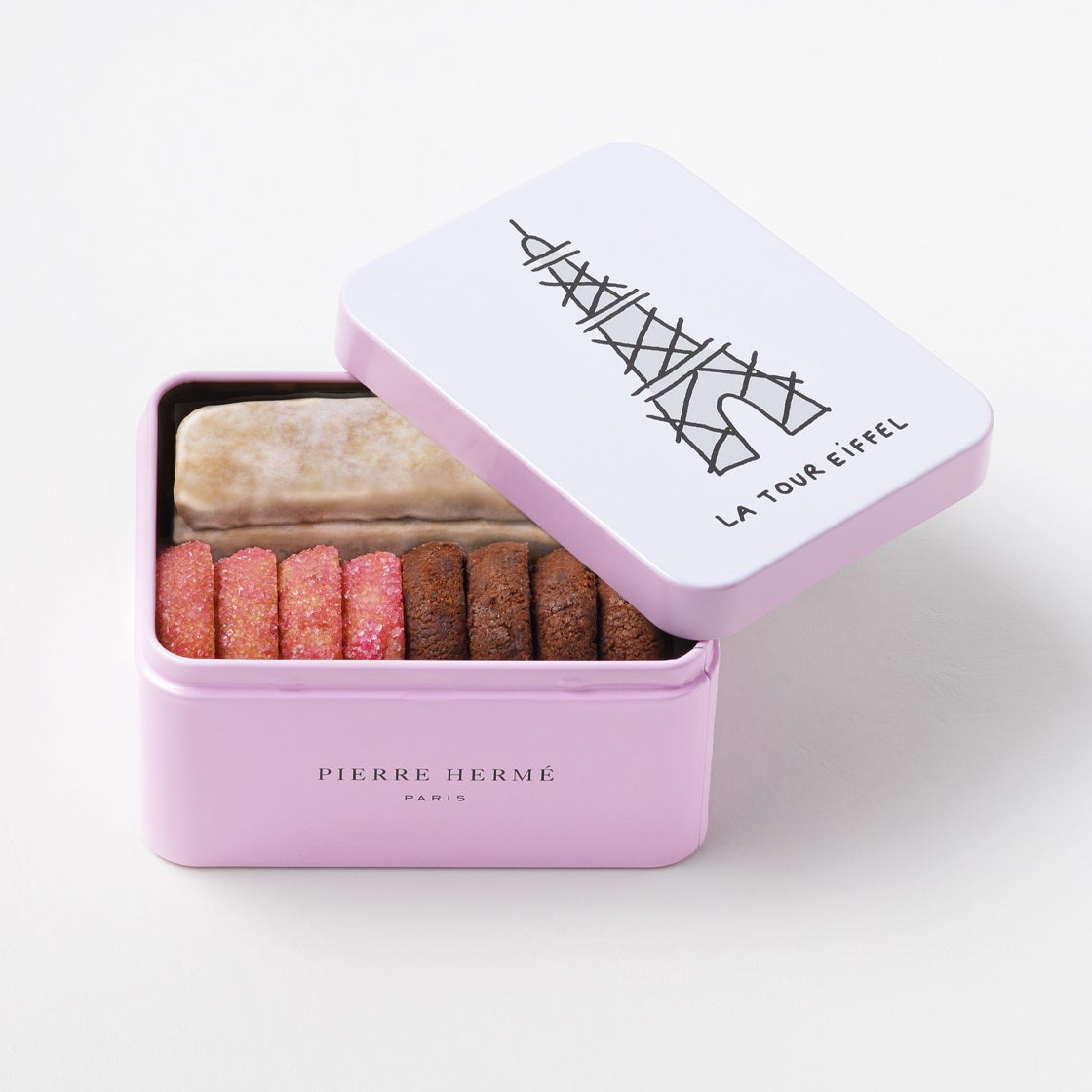 メゾンを代表するサブレ3種を、パリを象徴するエッフェル塔をあしらった特製缶に詰め合わせました。今回だけの特別な仕様でプティギフトにもおすすめです。サブレの内容は、バラとフランボワーズ、ライチのフレーバー「イスパハン」、チョコレートの美味しさを堪能できる「アンフィニマンショコラ」の定番2種と、この詰め合わせのみの限定で、レモンの香りが広がる「アンフィニマンシトロン」1種です。