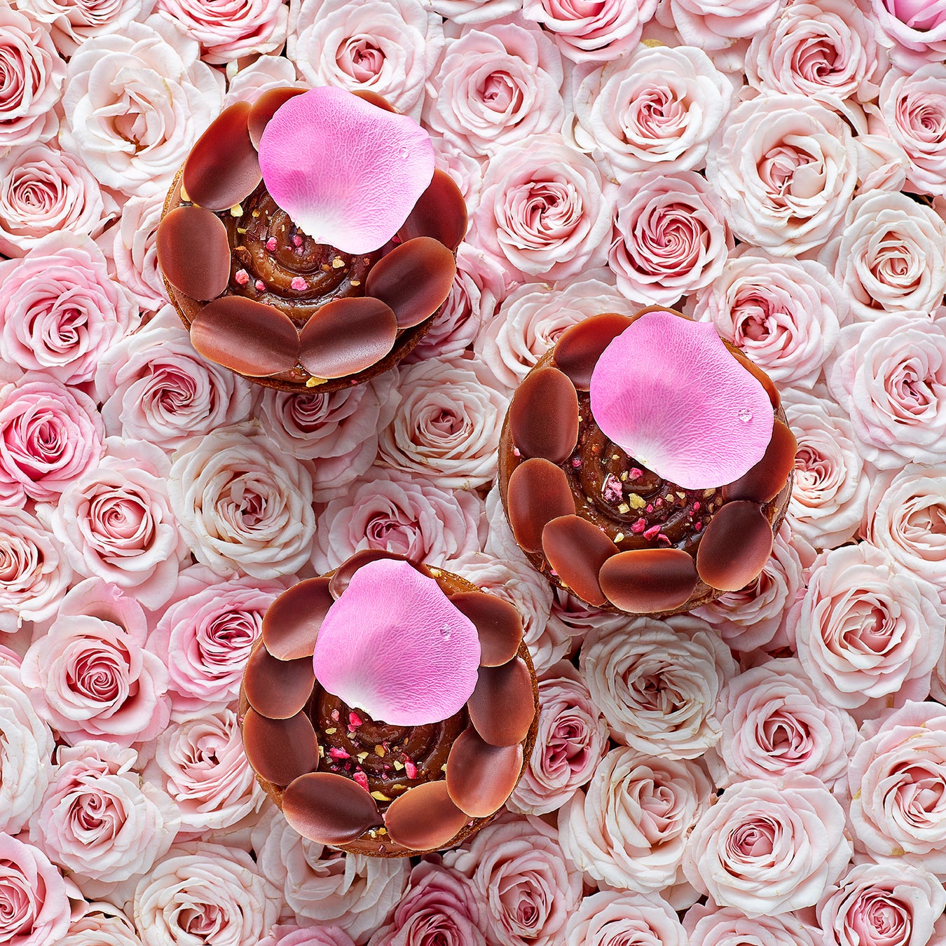 髙島屋のシンボルフラワーであり、ピエール・エルメ・パリのクリエーションを象徴する”バラ”の上品な香りと、ローストしたアーモンドの風味をまとったチョコレート、 香ばしいアーモンドプラリネが融合した華やかなパティスリー(生ケーキ)です。