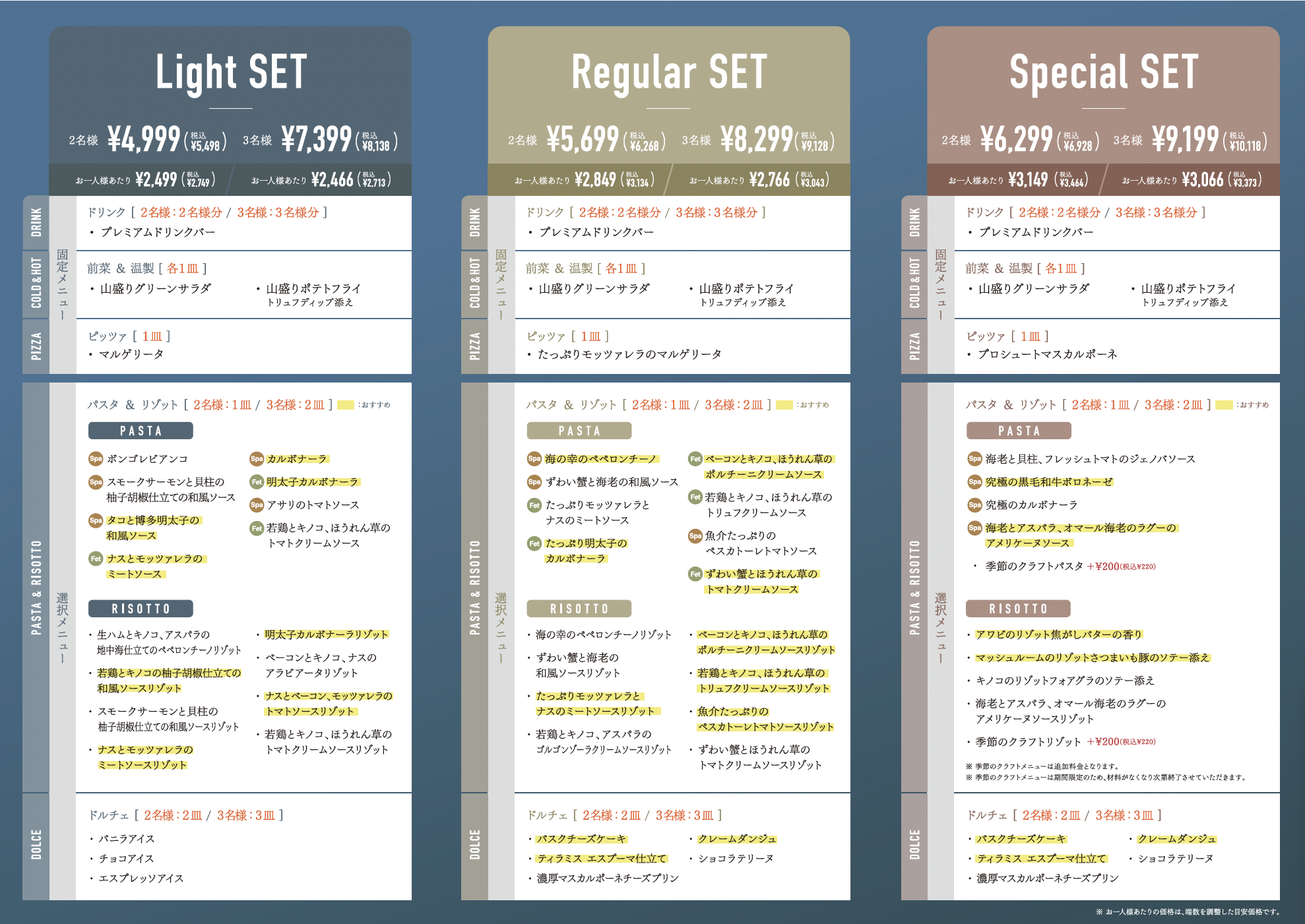 手軽に楽しめる「ライト」、ドルチェまでしっかり味わう「レギュラー」、少し贅沢な「スペシャル」の3つのプラン(それぞれ2名様用・3名様用)をご用意しておりますが、どのセットをお選びいただいても、単品でご注文いただく場合に比べて1,000円以上(税抜)お得になります。