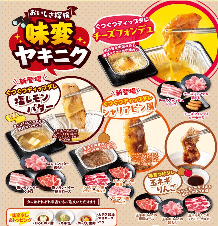 今回のリニューアルでは、いつもの焼肉を自分流にアレンジして楽しむ「味変(あじへん)ヤキニク」をさらに強化。難しいルールは一切なし!「次は何を試そうかな?」と、バラエティ豊かな美味しさを巡る「味の大冒険」のような、賑やかで安心感のある食べ放題をお届けします。