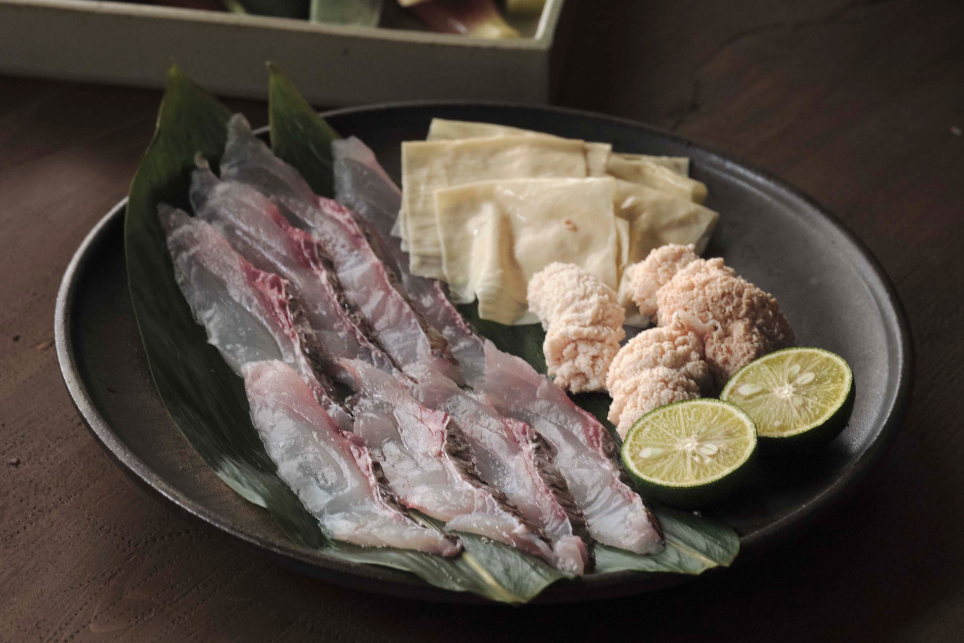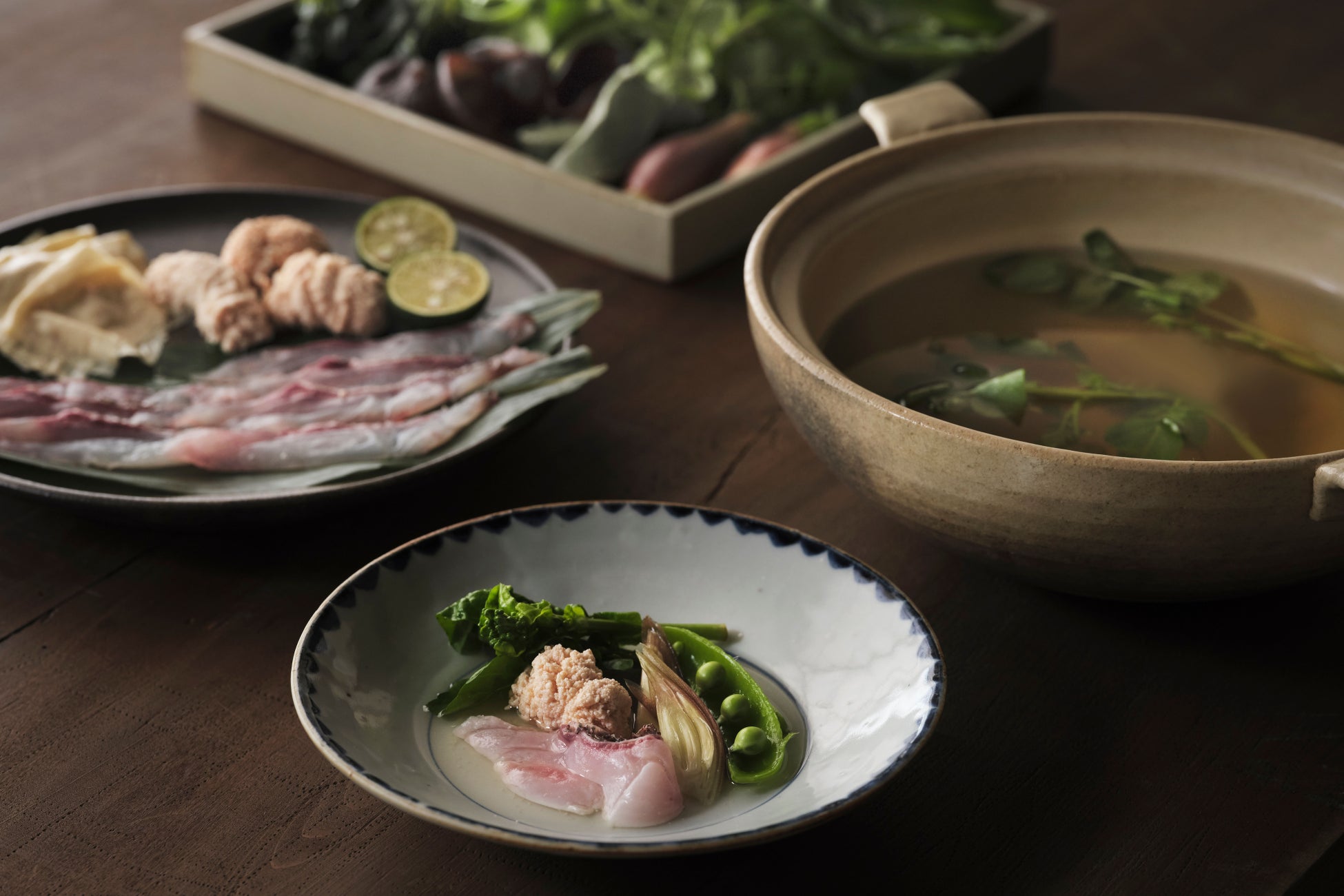 出汁を鍋に注ぎ、クレソンや茗荷、菊菜などの季節野菜を入れ、天然鯛をさっとくぐらせるだけで、初夏らしい味わいをお楽しみいただけます。